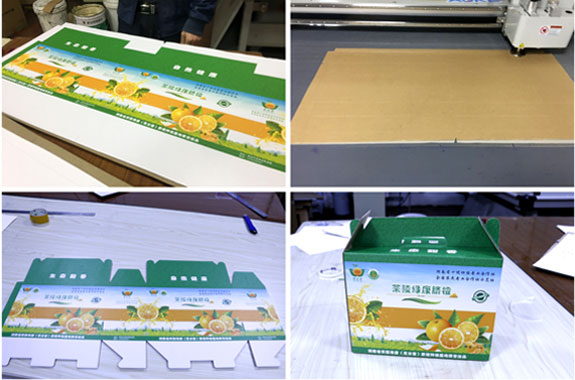 • 瓦楞纸包装盒打样( 脐橙包装盒制作):彩色喷墨机打印出来的颜色90%接近印刷颜色,再采用线切割划型,线条流畅、优美,盒型更加标准。