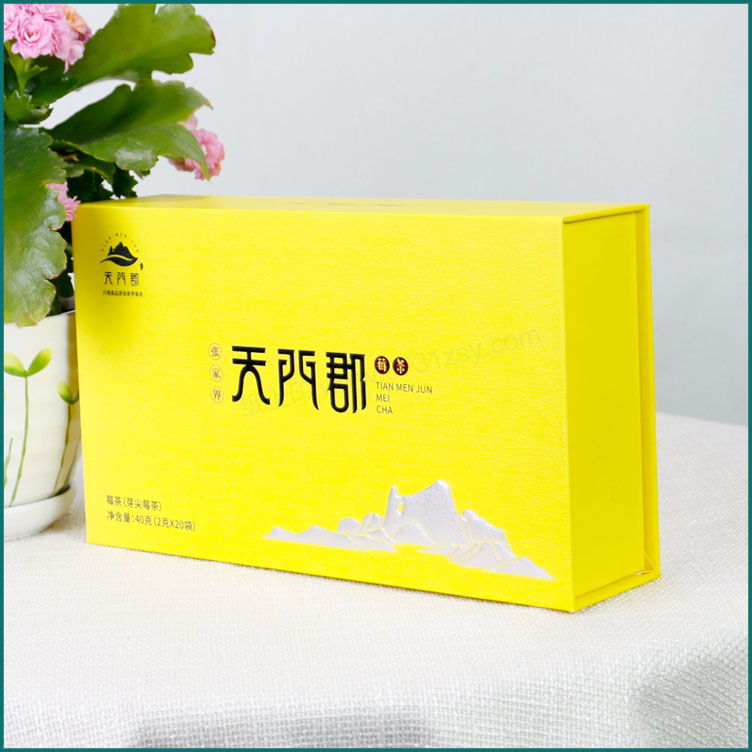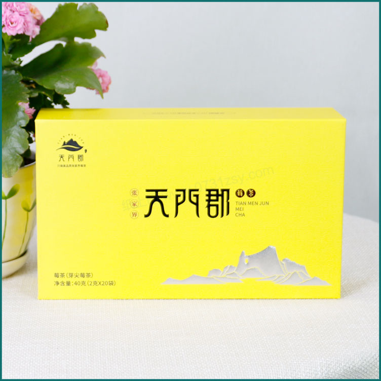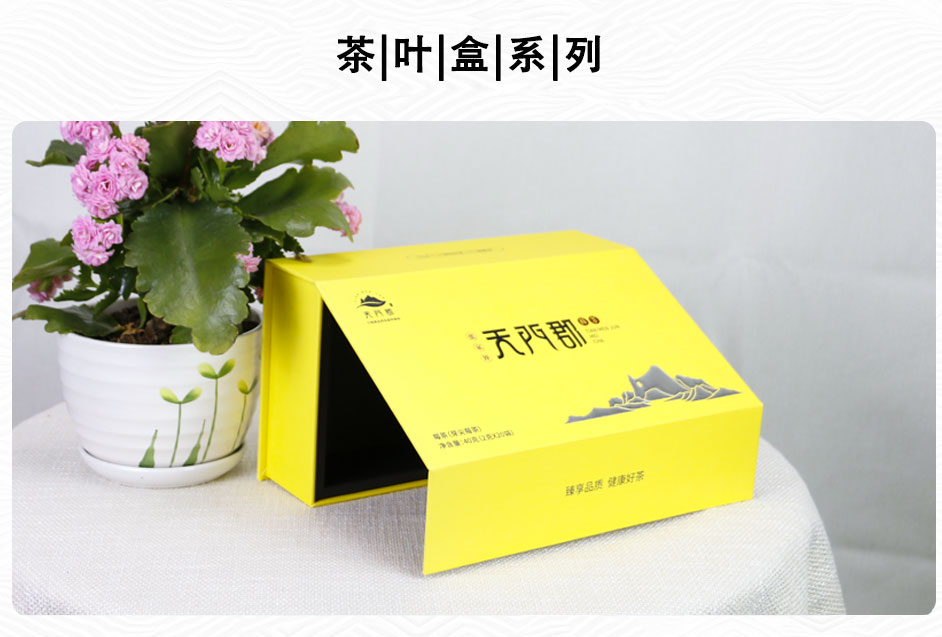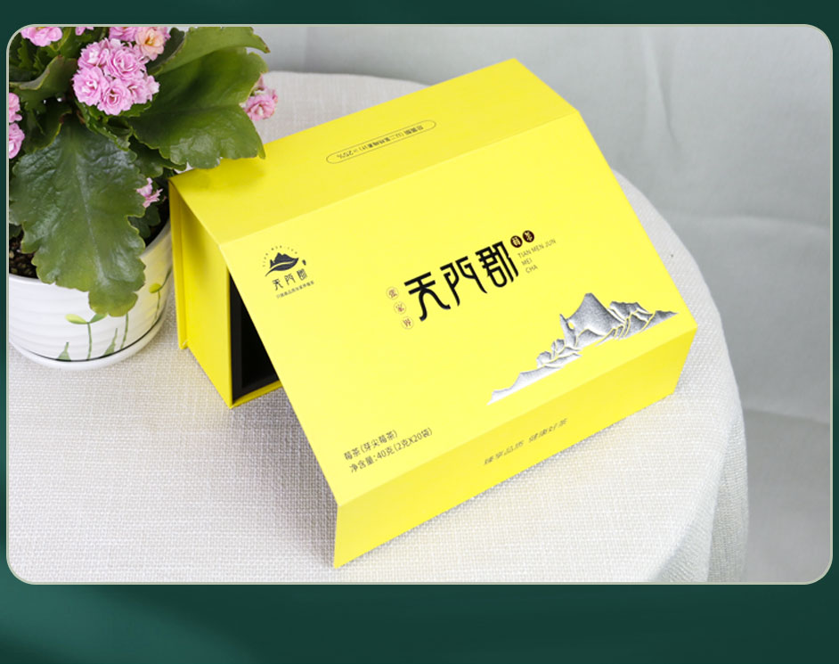 “天门郡”只做高品质张家界莓茶。张家界莓茶属显齿蛇葡萄小叶种,又称土家秘茶,生长在张家界当地海拔800~1500米的富硒红砂岩云雾山中,是土家族人传统的茶品,拥有源远流长的饮用历史。此款莓茶包装盒材质选用铜版纸覆触感膜裱灰板,内衬用到黑色的纸托,简洁大气,印刷材质同样也可用于保健品包装盒、礼品包装盒印刷、茶油包装盒等。