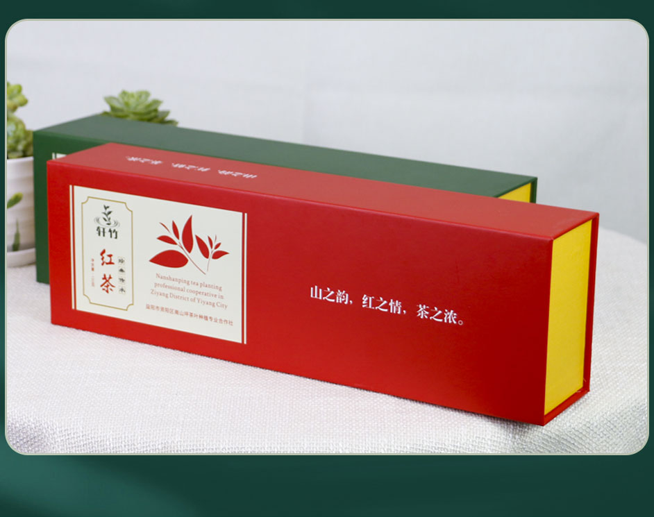 益阳市资阳区南山坪茶叶种植专业合作社成立于2015年06月25日,注册地位于益阳市资阳区新桥河镇梅花园村木子仑村民组33号,经营范围包括组织成员从事茶叶种植、销售,为成员提供茶叶种植的技术培训、技术交流和信息咨询服务。轩竹红茶、绿茶两款茶叶包装盒是由长沙毅丰包装厂设计制作而成,两款盒子的设计比较简洁,颜色上运用到比较艳丽的颜色,盒型是常见的书型盒,采用铜板纸裱灰板的印刷材质,印刷材质同样也可用于保健品包装盒、礼品包装盒印刷、茶油包装盒等
