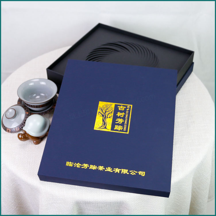 古树芳踪茶叶包装礼盒是一款天地盖盒,采用特种纸裱灰板的印刷材质,外盒烫黄金工艺,盒子内衬选用纸托,同款颜色不仅美观大方价格也很实惠。藏青色的特种纸在外盒做了烫黄金的工艺,简洁大方彰显品牌的高端。长沙包装盒厂毅丰为您介绍的这款印刷材质也适用于礼品包装、产品包装盒印刷、茶油包装盒等。