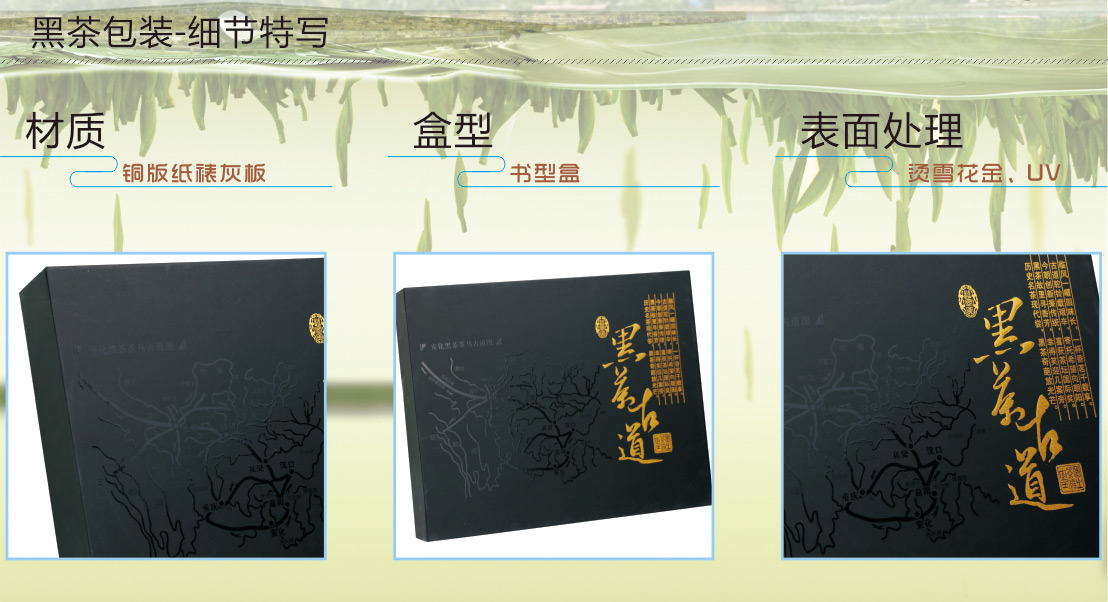 该款茶叶礼品包装盒采用了UV以及烫金工艺,增添了包装盒的质感与视觉冲击感,而书型盒因为取用方便成为了茶叶礼品包装盒较为常用的包装盒型之一,茶叶礼盒包装也常选用天地盖盒作为包装印刷盒型,这两种盒型还适用于食品包装盒,医疗器械包装盒等。