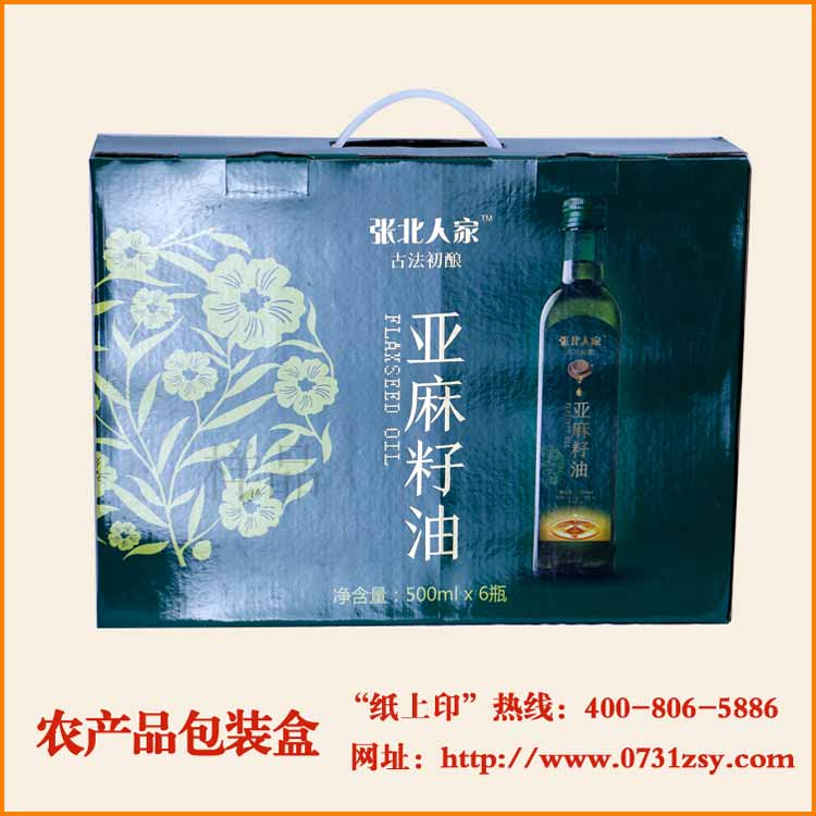【使用范围】:该款亚麻籽油包装盒材质还适用于粽子礼盒包装,礼品盒包装,茶叶包装礼盒等包装盒印刷制作。长沙茶油包装礼盒定做厂家,厂家500起印,提供免费设计与打样。