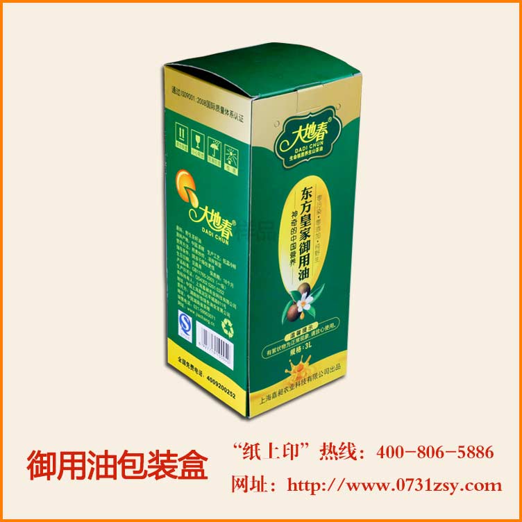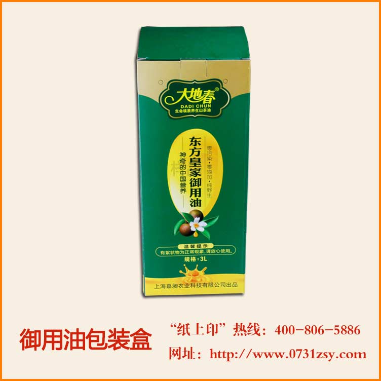 大地春东方皇家御用油零添加零污染纯野生山茶油包装盒是长沙毅丰包装礼盒厂设计制作的,湖南御用油包装盒订做毅丰包装厂是一家专注食用油包装盒设计,打样,印刷制作,包运为一体的大型包装礼品盒厂.设计制作一体化,免费设计,5~7天出货,当天出货当天送,咨询热线:13317315099