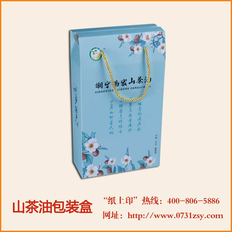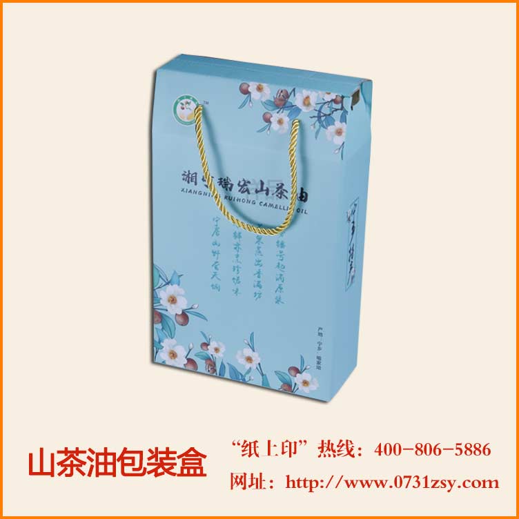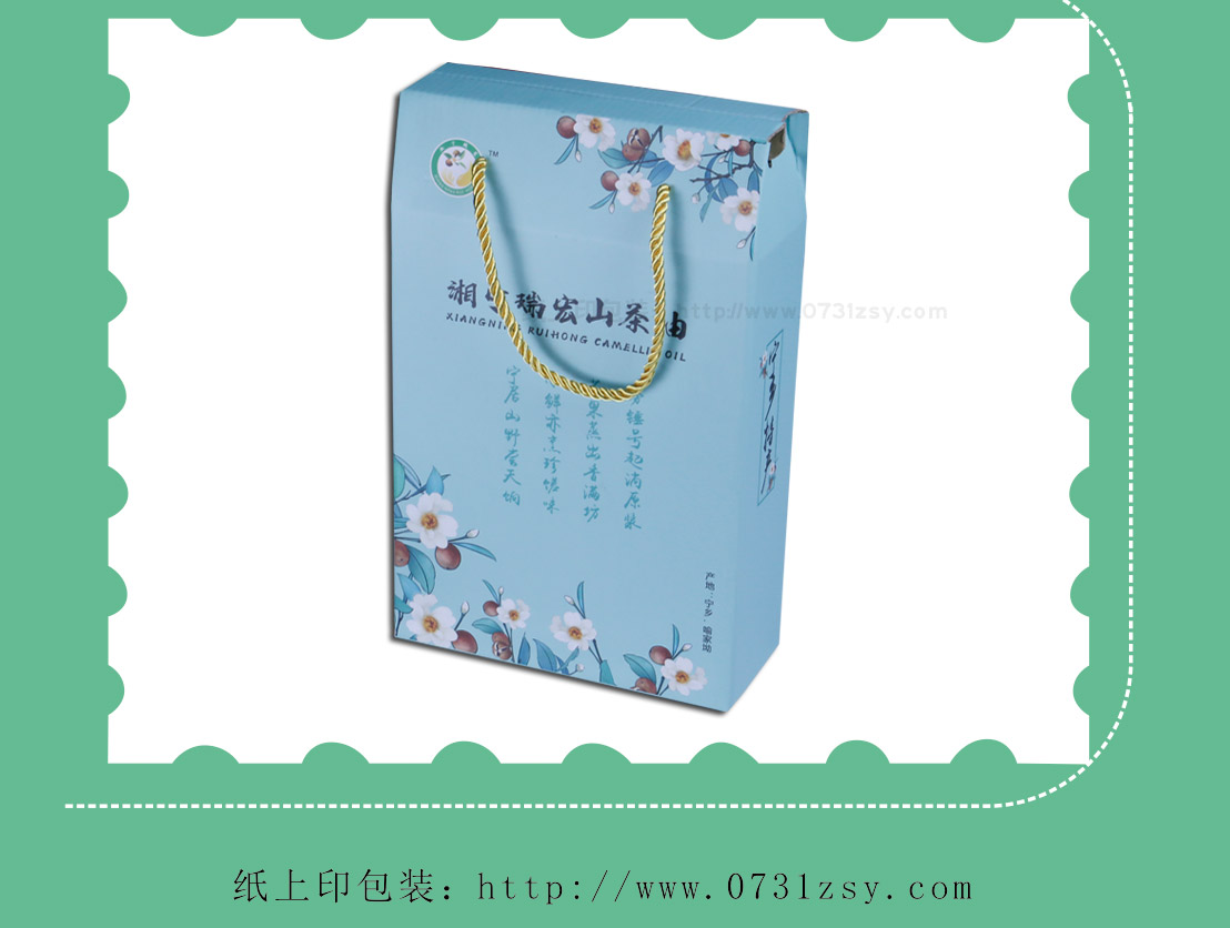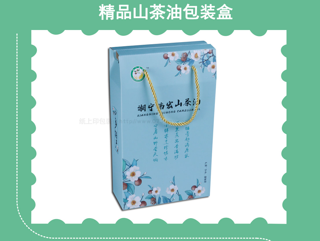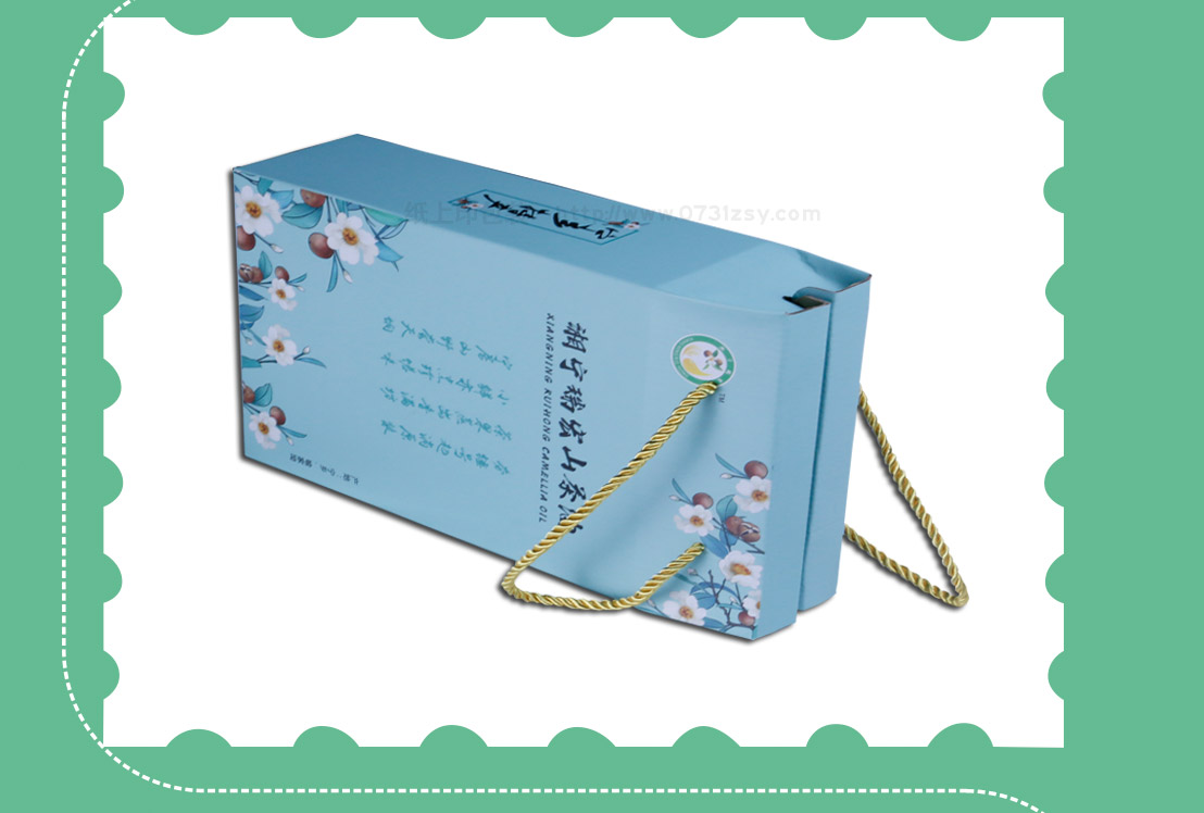 长沙山茶油包装长沙包装印刷厂专业为宁乡县瑞宏油茶林种植专业合作社设计制作了山茶油包装配套礼盒,此款包装礼盒采用白板纸裱瓦楞制作而成,盒子外观整体浅绿色配上金色提绳,简洁大方。采用手提盒便于客户提携,又能达到节约成本的目的。宁乡县瑞宏油茶林种植专业合作社对此款山茶油包装的品质很满意,因而与长沙毅丰包装厂达成长期的合作协议!纸质包装材料种类