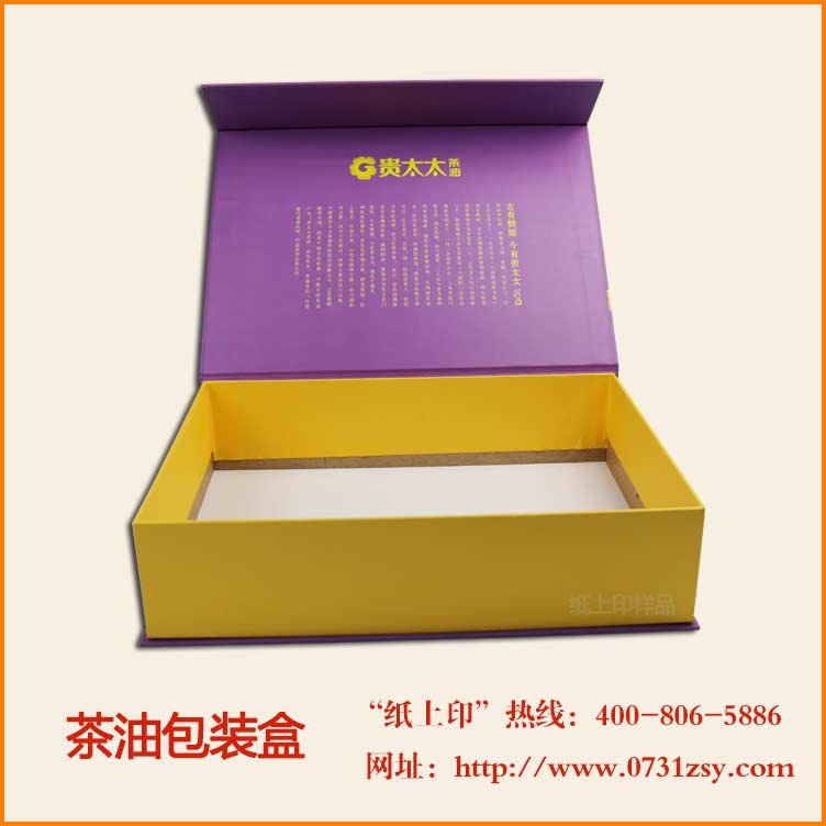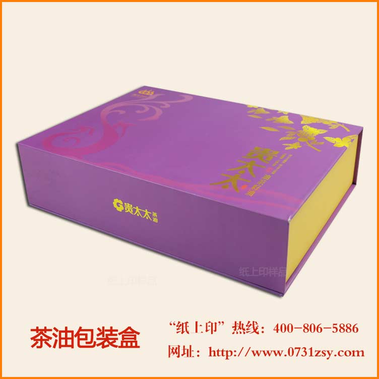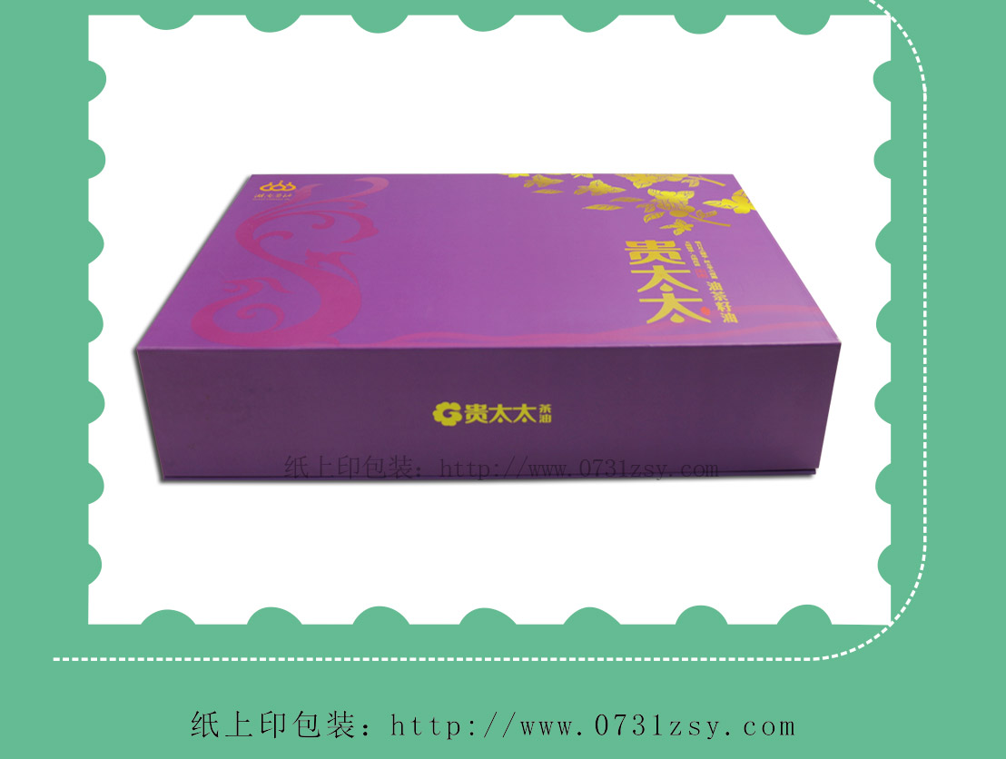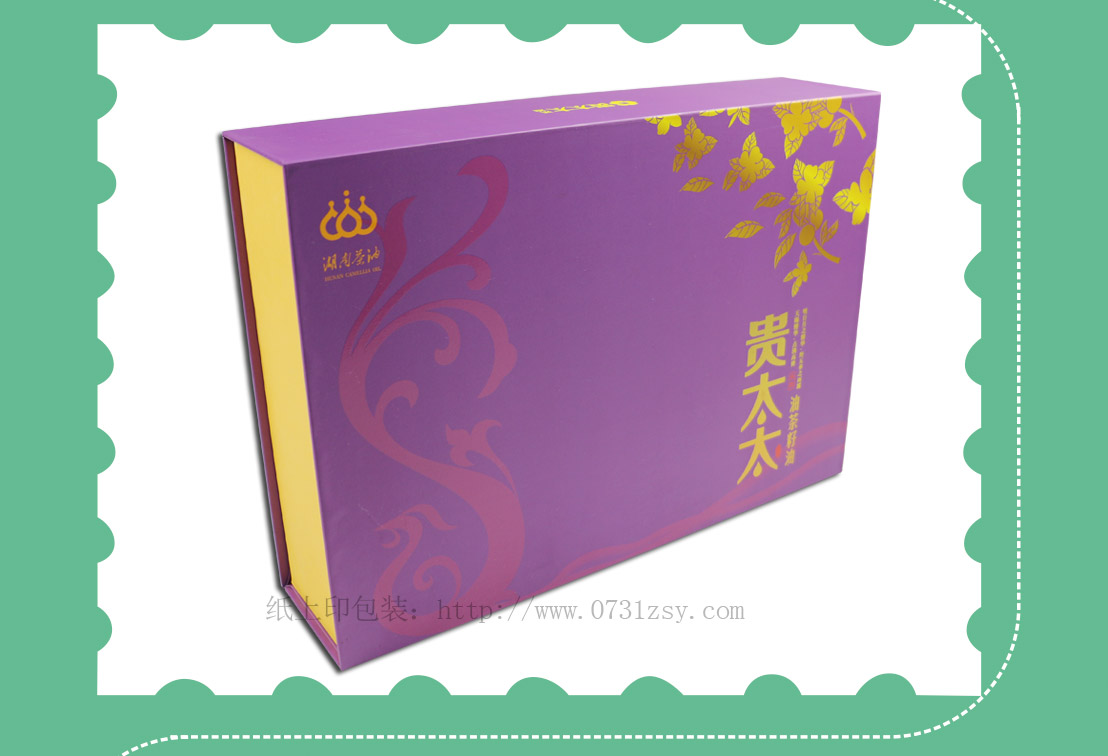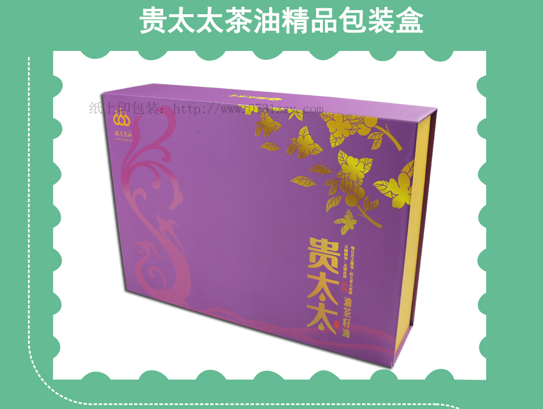 贵太太油茶籽油选用特种纸裱白板纸制作而成,包装盒整体设计采用紫色作为背景色,UV和烫金的工艺突出品牌名称和茶籽的图案,更彰显出贵气而不失优雅,结合产品特点“吸日月之精华,经五季之雨露,天赐精华,点滴高贵”,长沙茶油包装盒定制毅丰包装厂为客户设计制作的这款包装盒得到了客户高度赞誉。