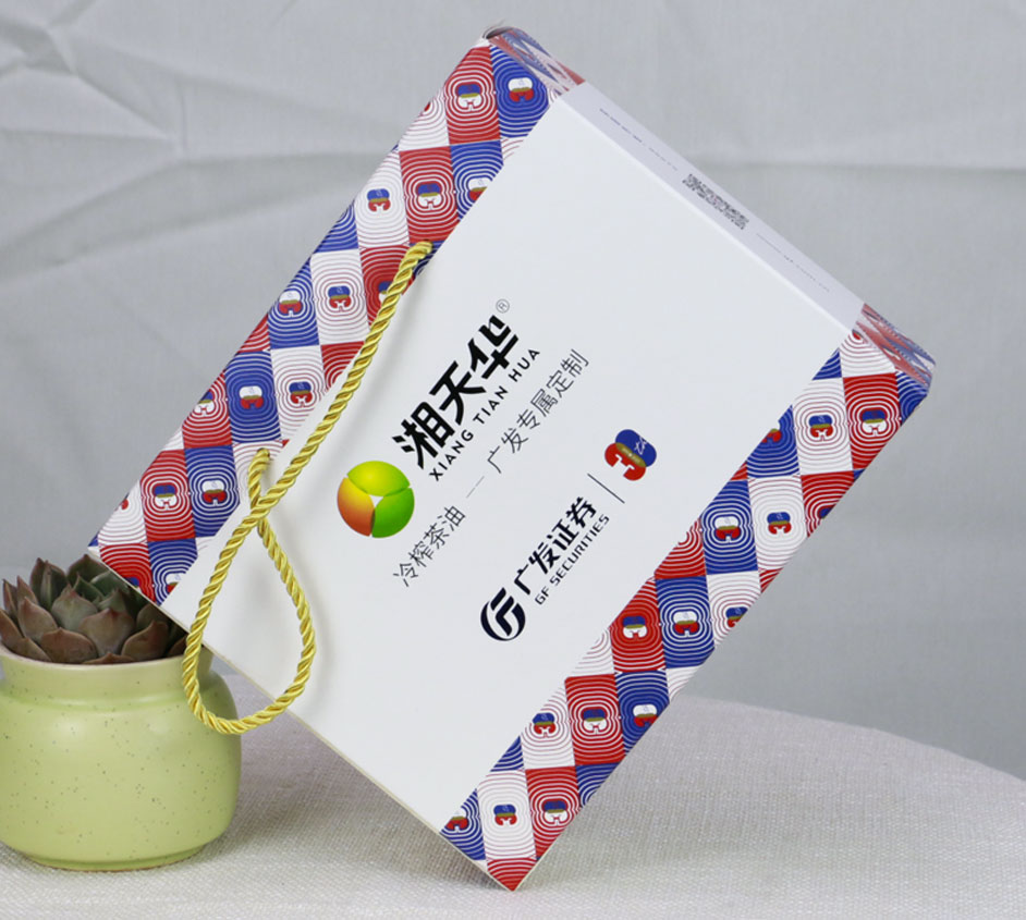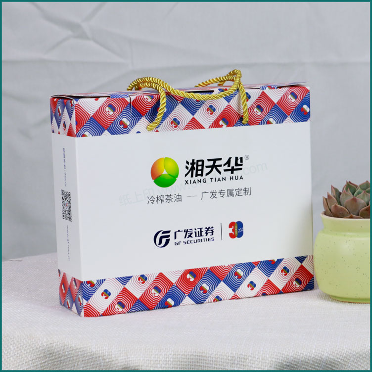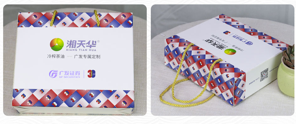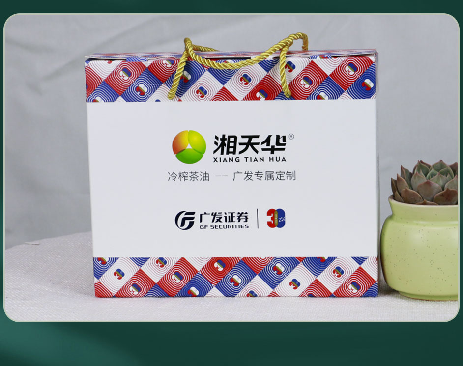 湘天华冷榨茶油包装盒定制材质为白卡对裱,是广发证券30周年专属定制,出自长沙包装盒厂家毅丰包装,此款茶油包装盒是一款单插提绳盒,包装盒外盒烫蓝金工艺,茶油盒设计简洁、方便提携,其材质也比较实惠,是节日礼盒定制的优选,同样也适用于茶油包装,红酒包装,食品包装盒,特产礼盒,大米礼盒包装等,厂家定制提供设计打样,热线:4008065886