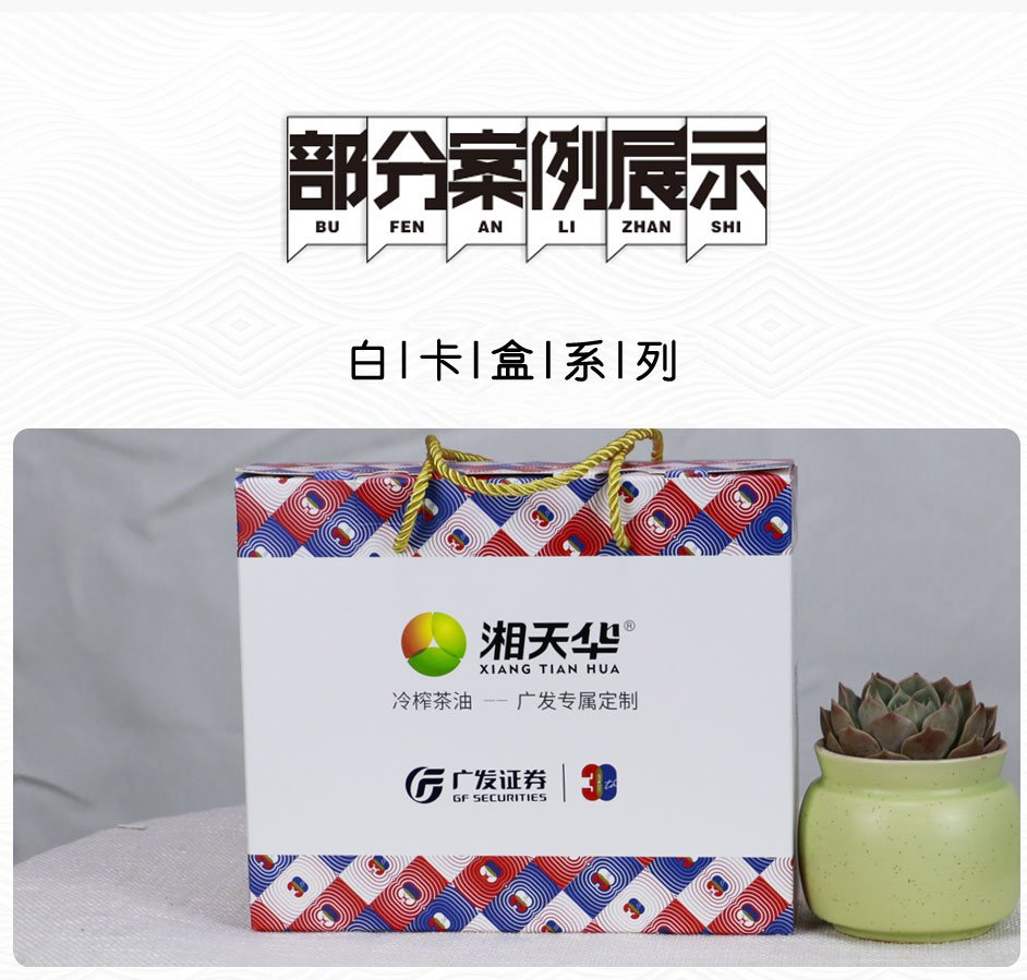 【使用范围】:湘天华冷榨茶油包装盒定制材质为白卡对裱,广泛适用于茶油包装,红酒包装,食品包装盒,特产礼盒,大米礼盒包装等,厂家定制提供设计打样,热线:177-6366-7656