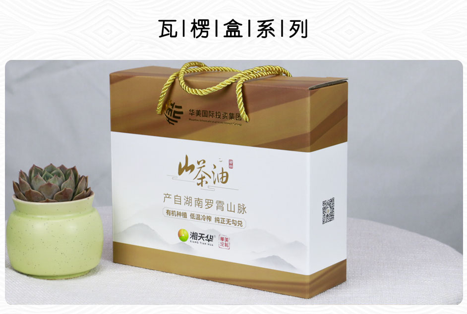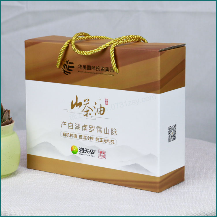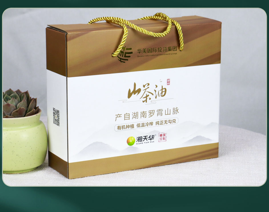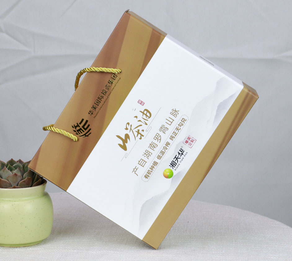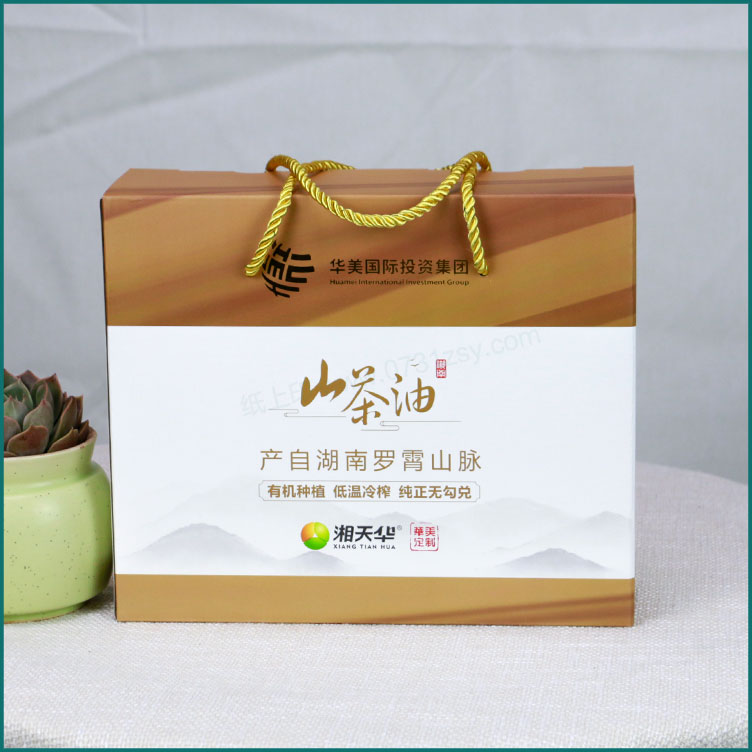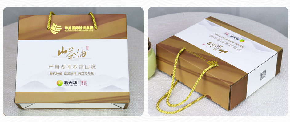 湖南天华油茶科技股份有限公司(简称湘天华)为广东将苑健康产业发展有限公司的控股子公司,成立于2007年11月,与长沙包装盒厂毅丰包装设计合作多年,此款茶油包装盒定制是华美国际投资集团定制的茶油礼盒,材质为白卡纸裱瓦楞,盒型是一款单插提绳盒,公司名称和LOGO烫黄金工艺,其材质广泛适用于山茶油包装,酒类包装,水果包装盒,特产礼盒,大米礼盒包装等