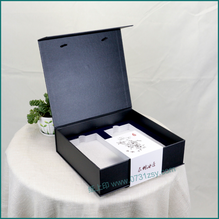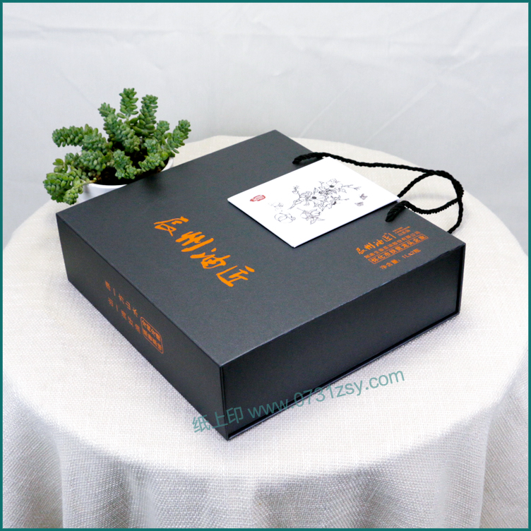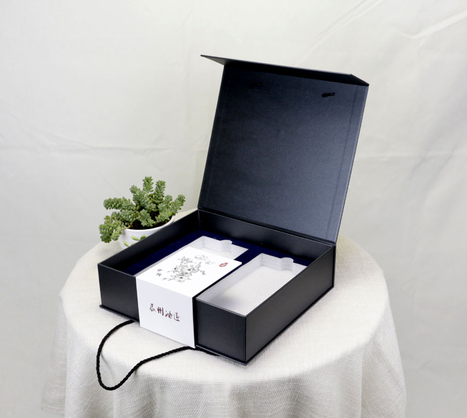 此款山茶油包装盒定制材质为特种纸裱灰板,出自长沙包装印刷厂毅丰包装,盒型为书型盒,珍珠棉裱绒布的内衬,可放置两瓶茶油装,茶油盒的颜色为黑色的特种纸,搭配上烫金的工艺,整个盒子呈现内涵大气的调性,广泛适用于山茶油包装,茶叶包装,高档礼盒包装,大米礼盒包装等