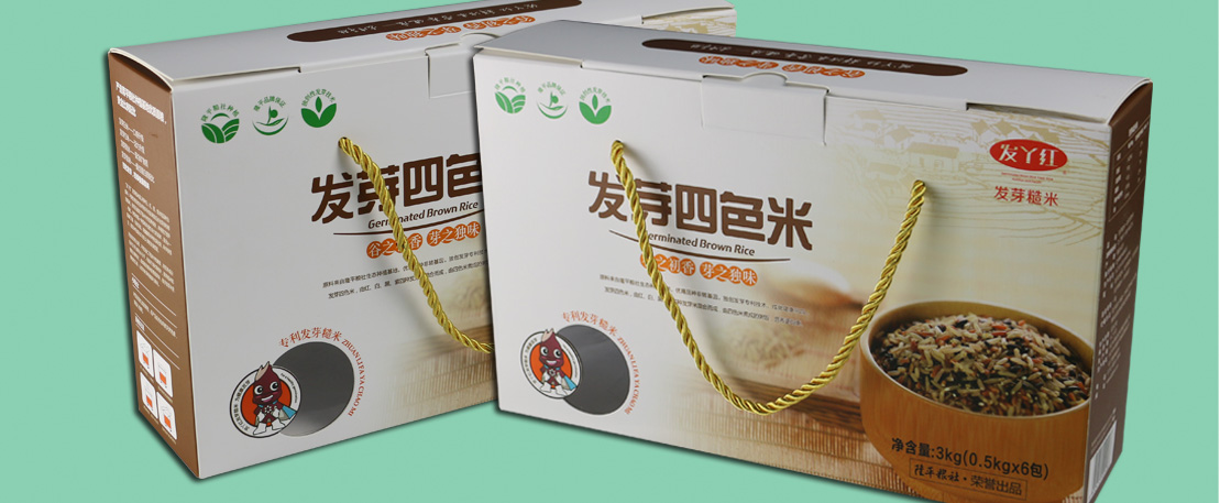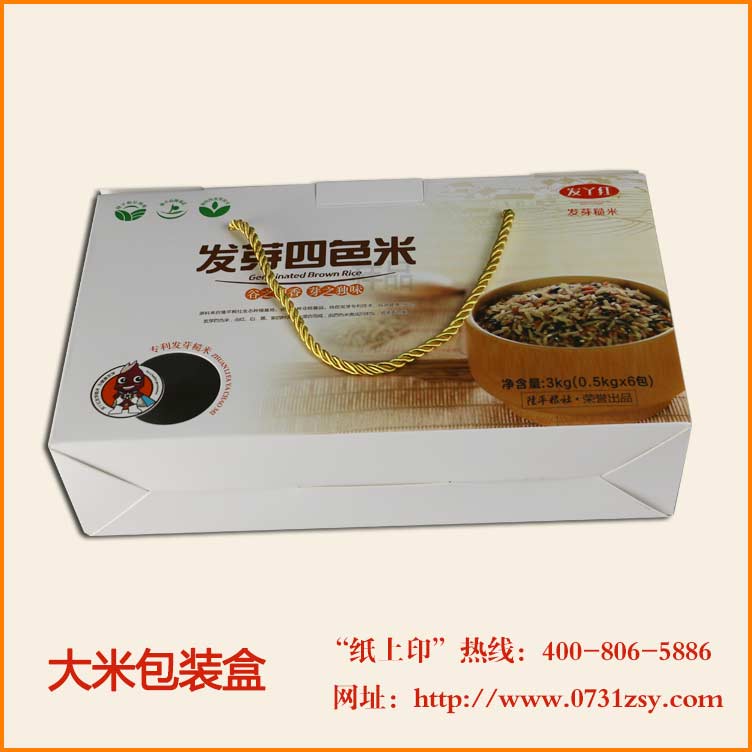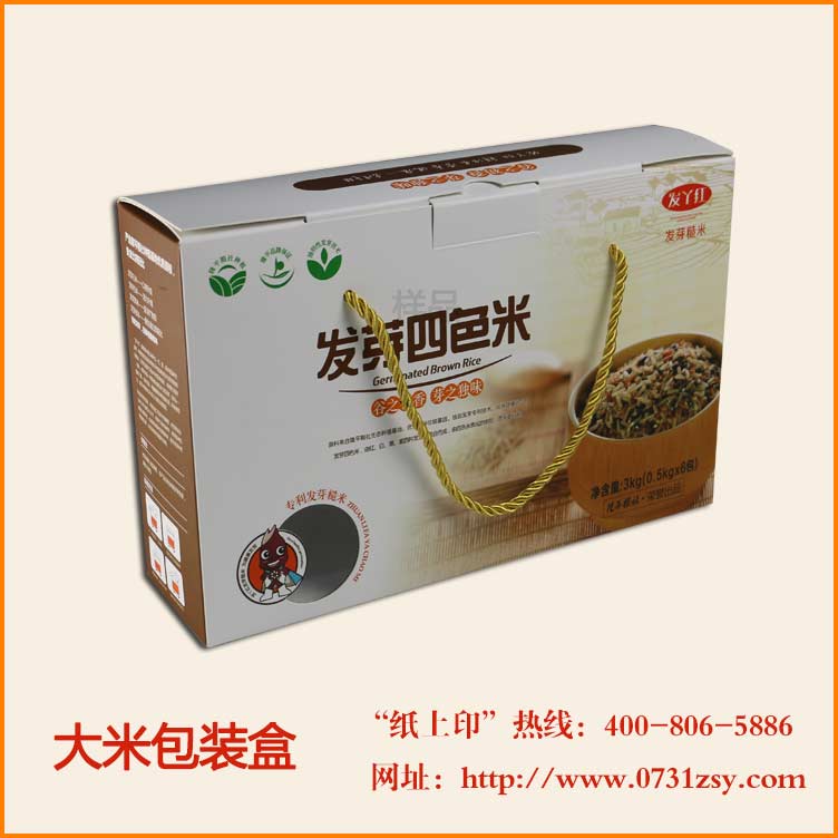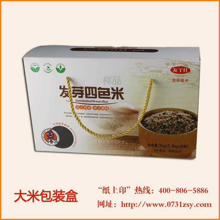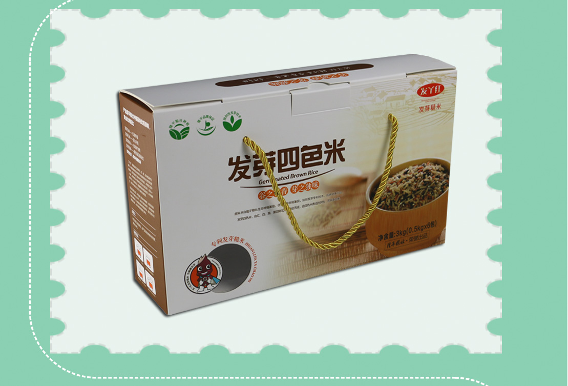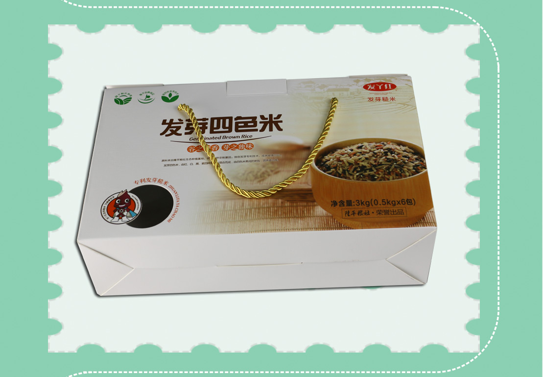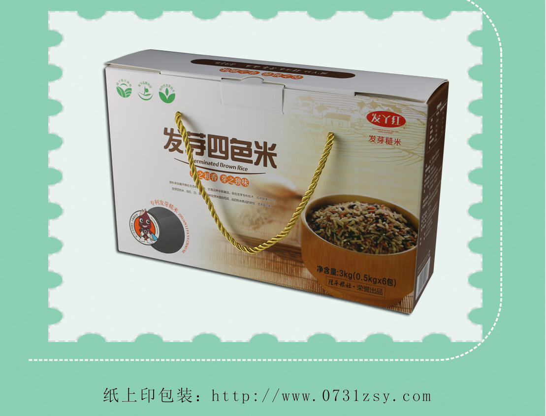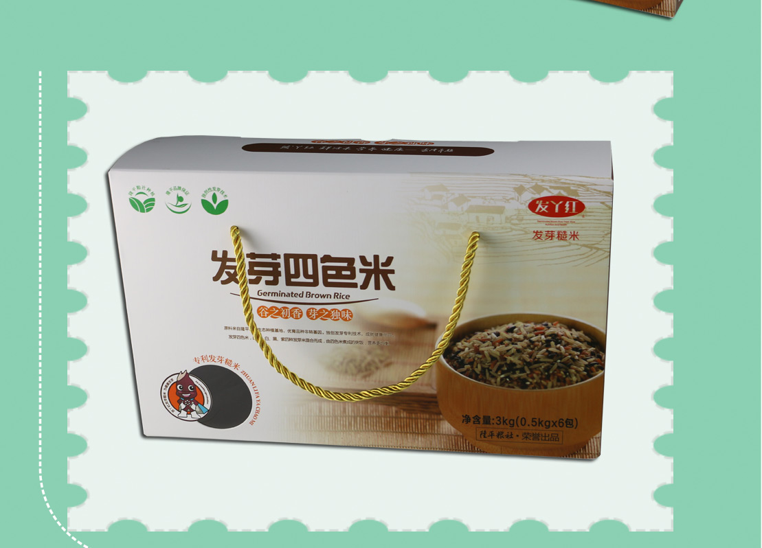 发芽四色米材质选用600克白卡纸,采用开窗贴膜片、压纹的工艺制作而成,此款卡盒广泛适用于农产品包装盒,腊鱼/腊肉包装盒,特产包装盒,产品包装盒,活鸡/鸡蛋包装盒等,长沙大米包装盒订做厂家,免费设计,1至2天定稿。