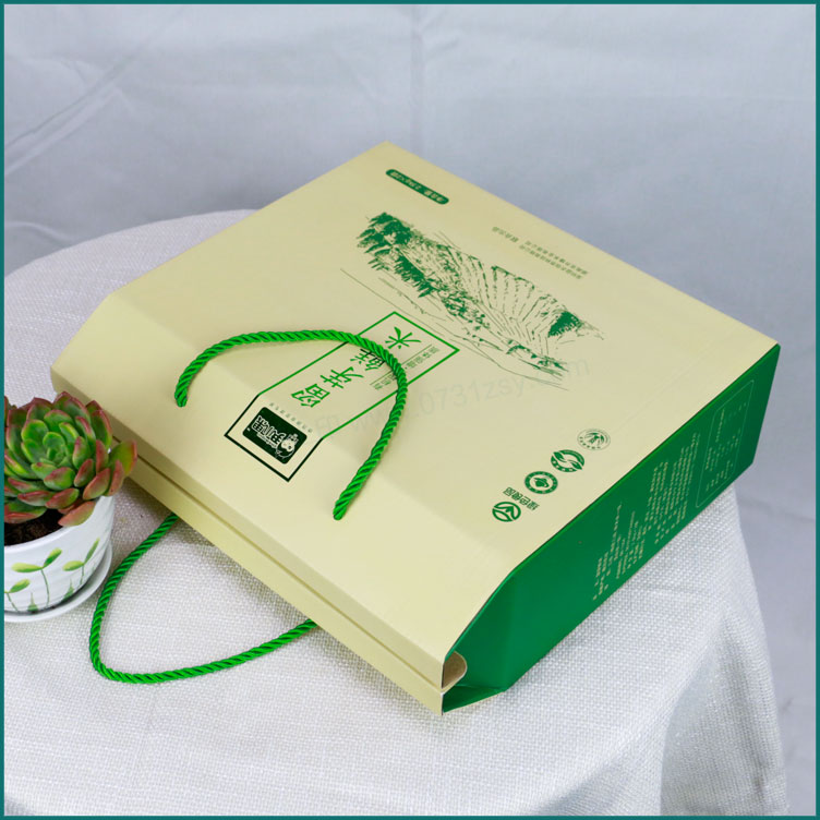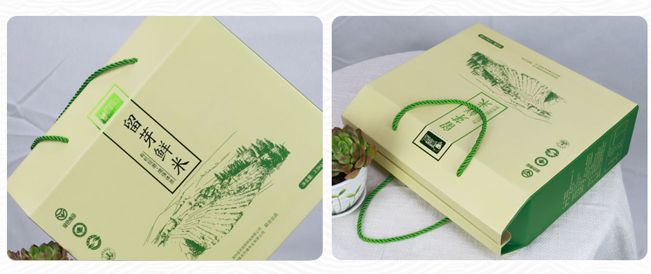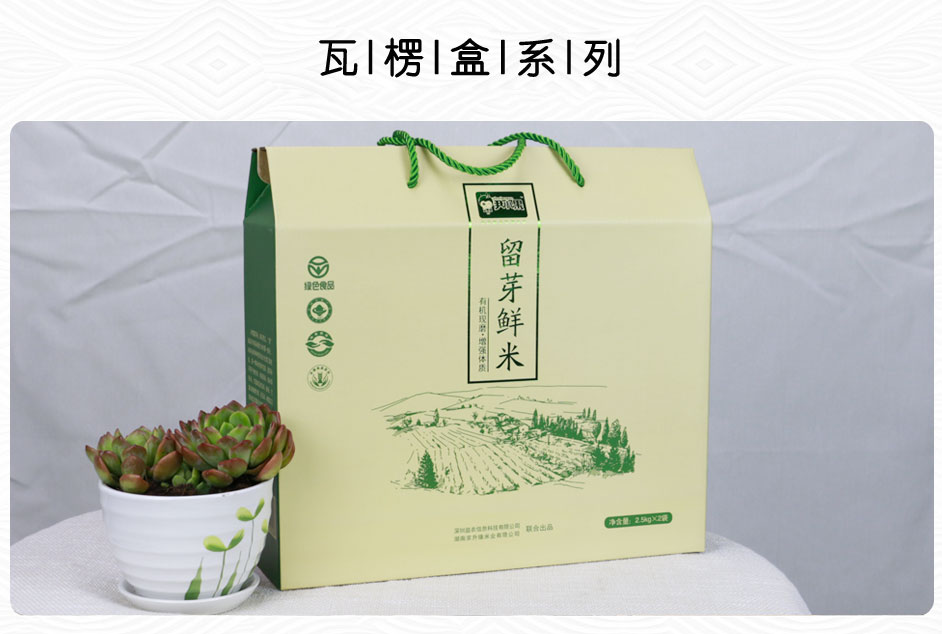 【使用范围】:留芽鲜米包装盒材质为白板纸裱瓦楞,是一款手提斜面双插盒,广泛适用于农产品包装,水果包装礼盒,土特产包装盒,腊鱼腊肉包装盒等