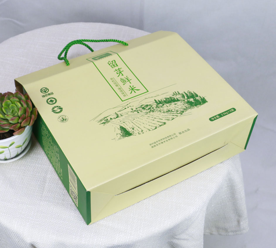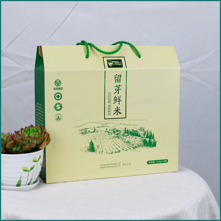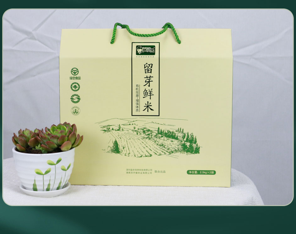 民以食为天,所谓留芽米,顾名思义“芽”就是孕育稻谷新生命的那一部分,米具有的种种营业成分全部汇集在此,是一颗米的营养宝库。长沙大米包装印刷厂家毅丰包装制作此款留芽鲜米包装盒,材质为白板纸裱瓦楞,是一款手提斜面双插盒,外盒烫绿金,广泛适用于农产品包装,水果包装礼盒,土特产包装盒,腊鱼腊肉包装盒等