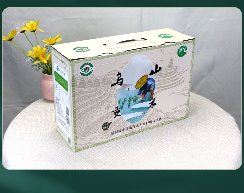 乌山贡米包装盒材质为白卡纸裱瓦楞,是一款常见的提手盒,由长沙包装盒厂毅丰包装生产制作,用于装5kg大米,盒子整体牢固承重强,用白卡纸裱瓦楞也不会现瓦楞,非常精致美观,广泛适用于农产品包装,水果包装礼盒,土特产包装盒,腊鱼腊肉包装盒等
