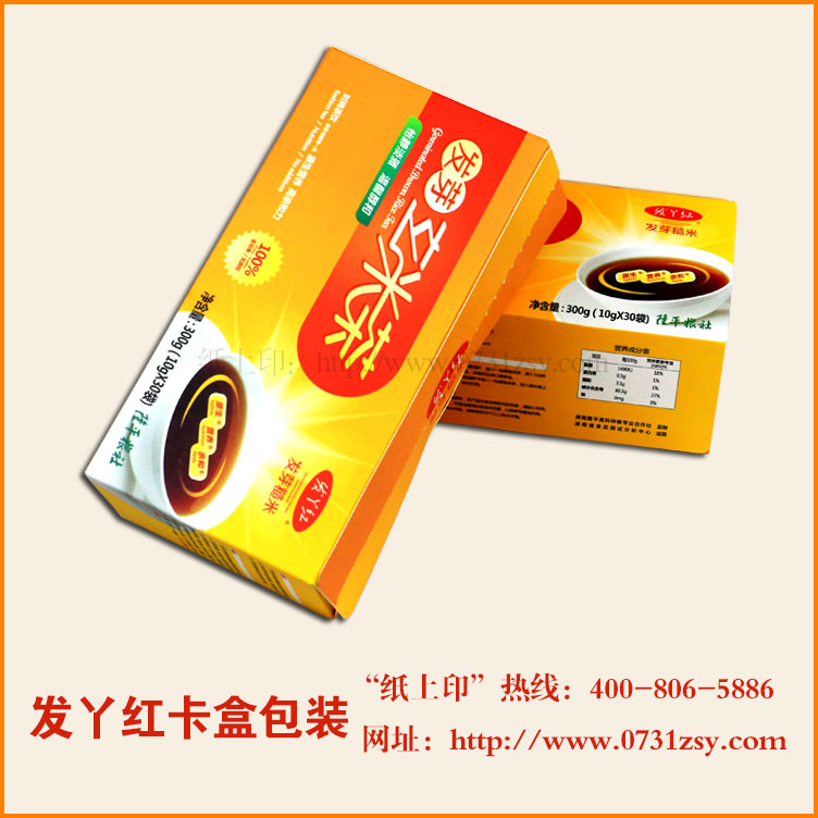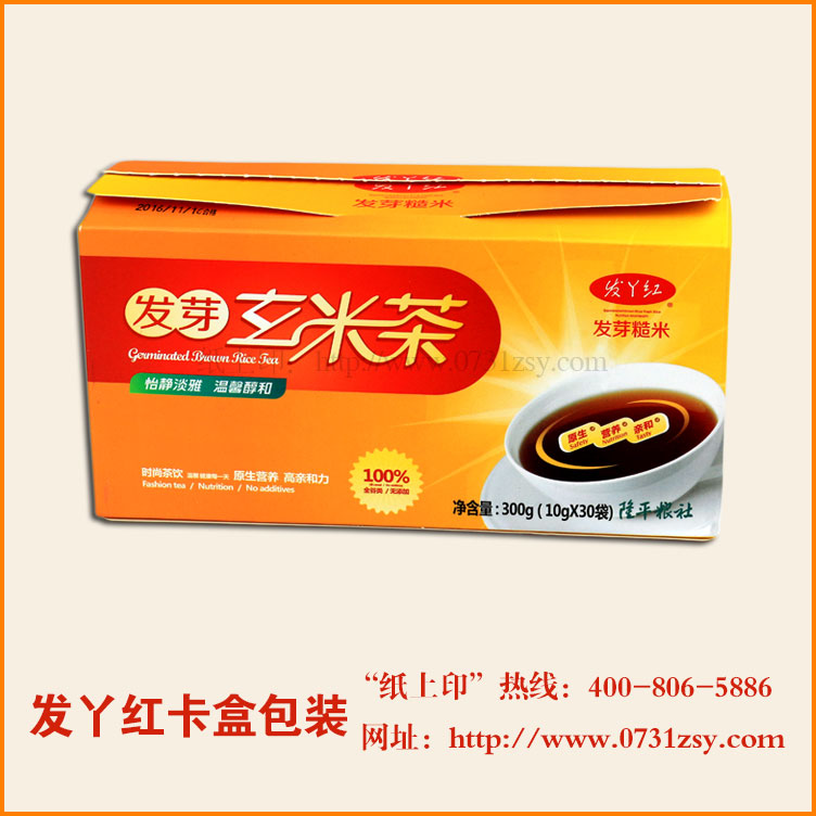 长沙毅丰包装专业印刷制作农产品包装盒,如长沙大米包装盒,腊肉包装,土鸡蛋包装盒,鸡包装盒,蜂蜜包装盒,主要采用瓦楞纸制作而成,而此次为发丫红制作玄米茶包装盒是采用卡纸包装制作而成,外观简单明了,包装盒轻便。“发丫红”发芽糙米由中国杂交水稻之父袁隆平院士领衔的研究团队开发生产而成。“发丫红”米是以袁隆平研发的杂交稻红稻、紫稻为主要原料,采用具有自主知识产权的稻谷发芽生产新工艺,通过先进的现代加工设施生产出来新产品,具有发芽整齐、芽势旺盛、有效成分丰富等特点。