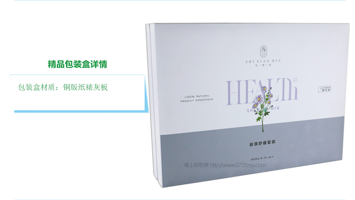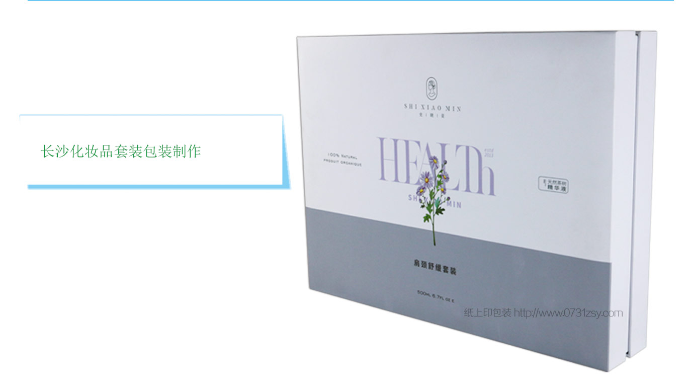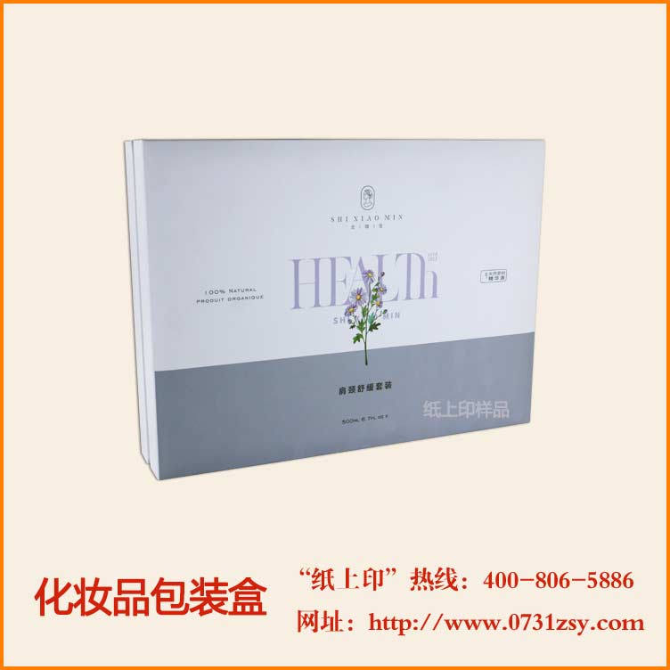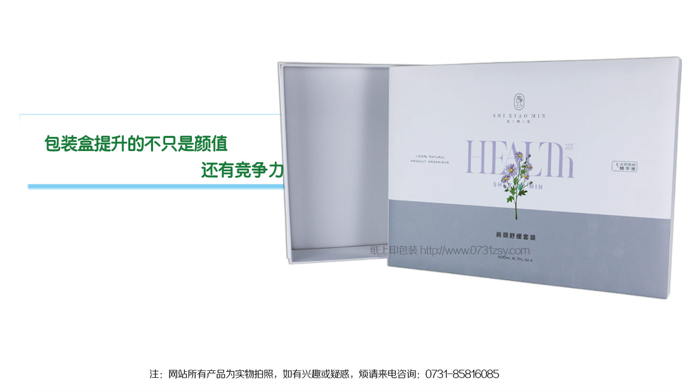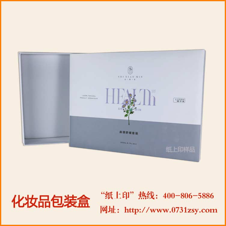 【使用范围】:此款化妆品包装盒为天地盖包装盒,广泛使用于:产品包装礼盒、茶叶包装盒、食品包装礼盒、茶油包装礼盒等包装盒领域.长沙化妆品包装纸盒厂家专业定制,交货快!