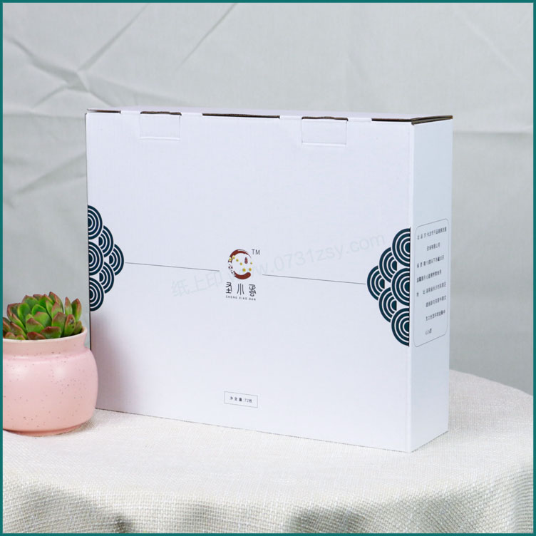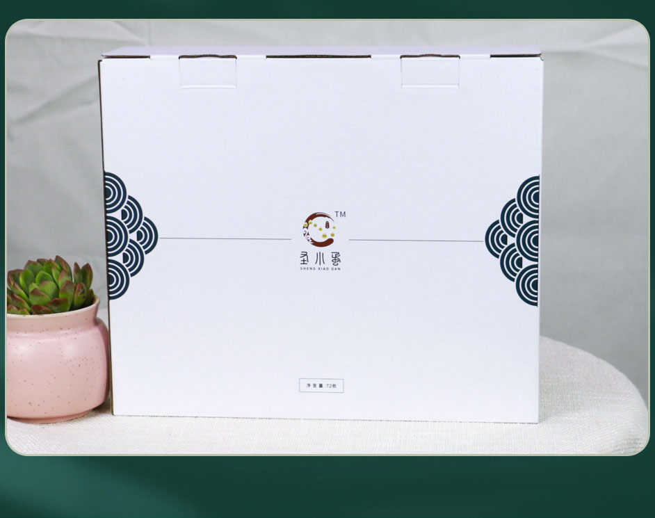 圣小蛋鸡蛋礼品盒包装定制盒型为单插扣底盒,长沙包装盒厂毅丰包装为此款鸡蛋盒提供设计印刷生产服务,在设计上非常简洁明了,材质选用白板纸裱三层瓦楞,可承重5~8斤左右,此款包装盒材质广泛应用于土鸡蛋包装盒印刷,水果包装盒定制,特产礼盒包装以及腊鱼腊肉包装盒等。