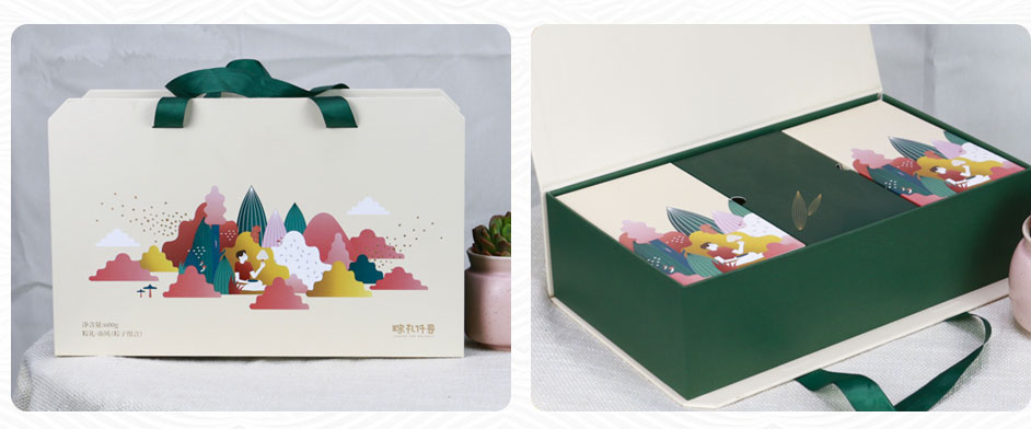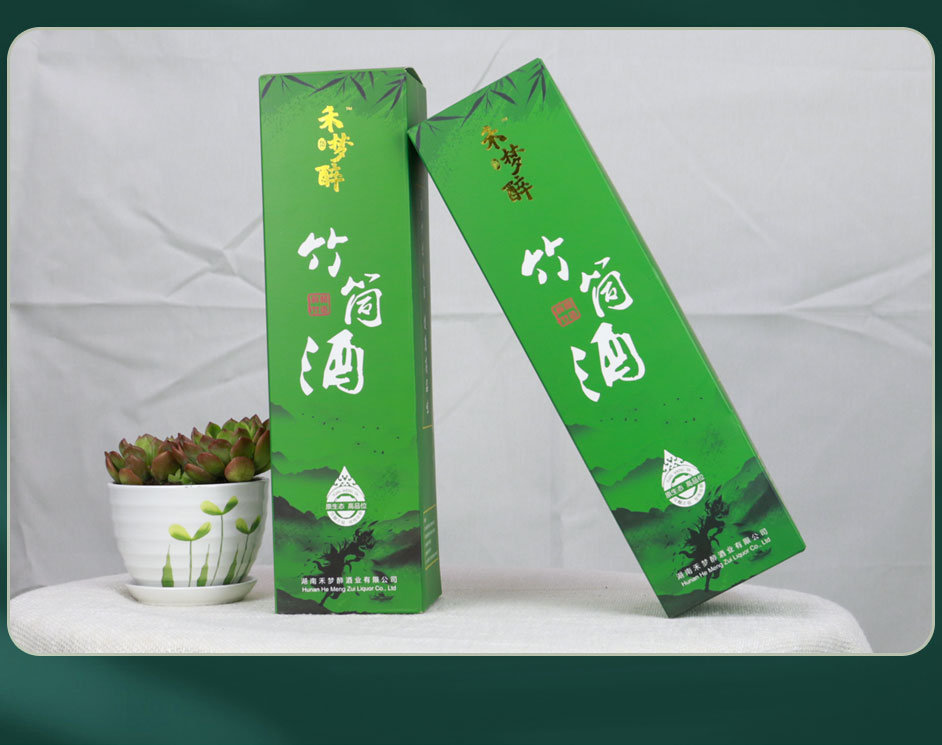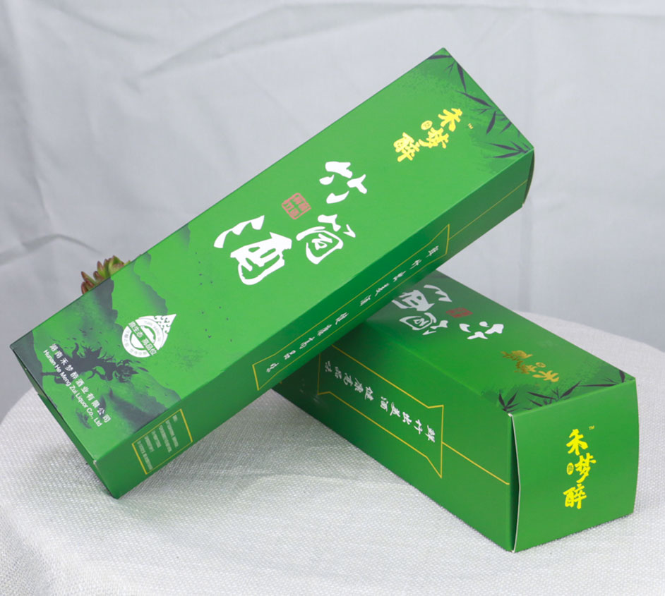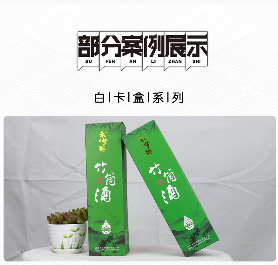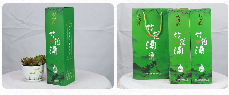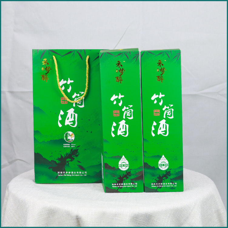 湖南禾梦醉酒业有限公司委托长沙包装盒印刷厂家毅丰设计生产出此款包装盒,包装盒整体颜色是绿色,也代表了禾梦醉酒业原生态的生产理念,两个卡盒配同款手提袋方便提携,美观大方,包装盒的成本也不高,是很多客户做包装礼盒参考的材质,此款竹筒酒包装盒也适用于食品包装,特产礼盒包装,茶油包装等。