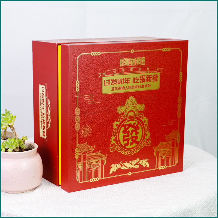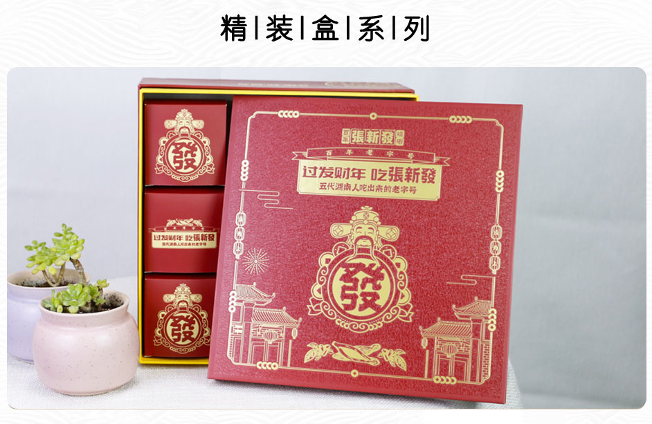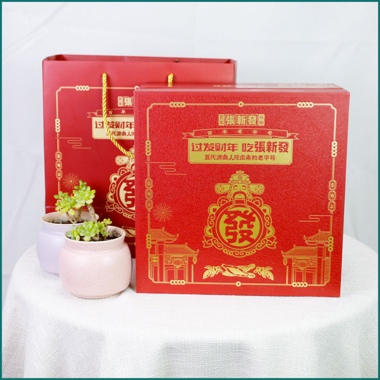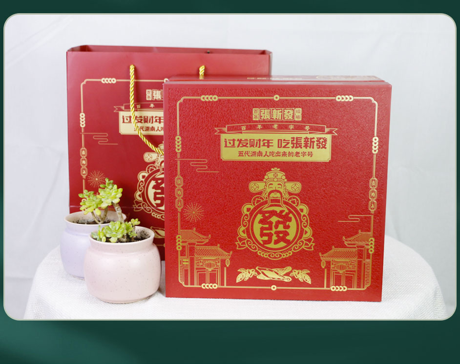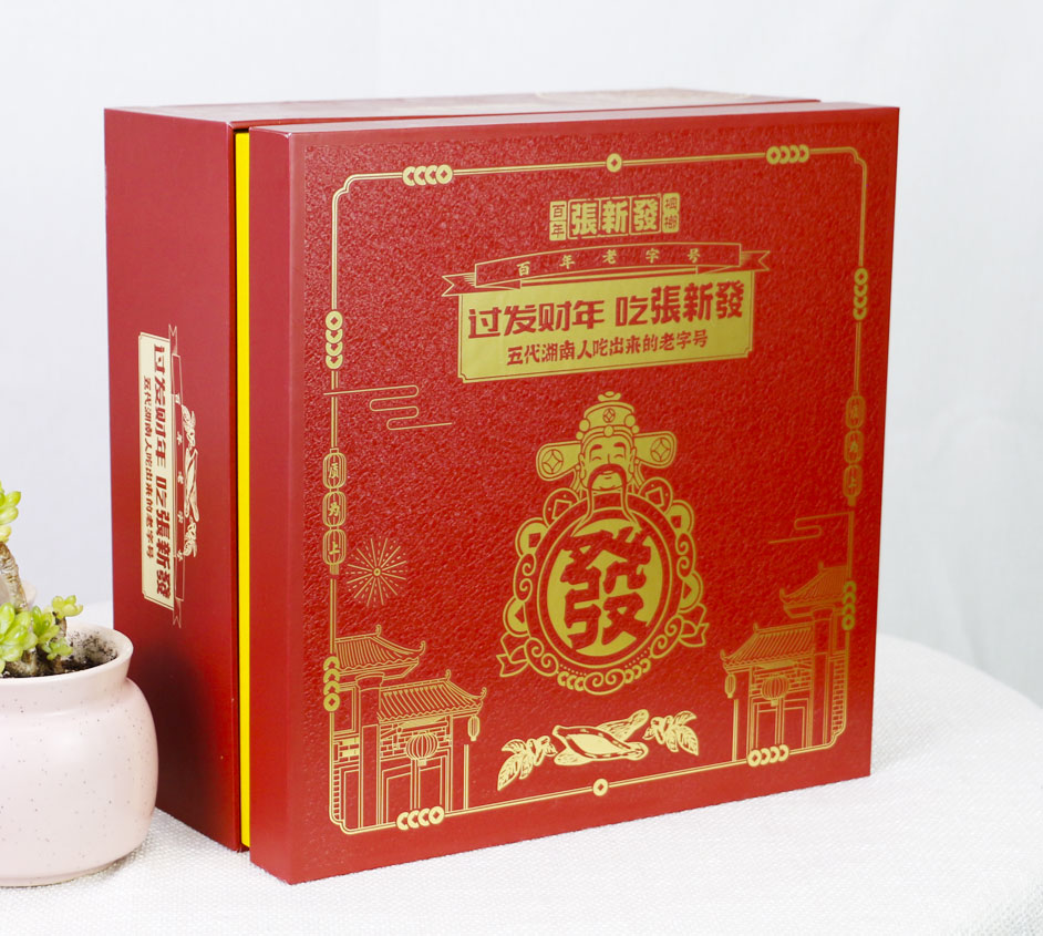 “张新发”作为槟榔行业唯一的百年老字号和非物质文化遗产,融入了现代生产理念:保护和传承好非物质文化遗产-百年张新发槟榔传统制作工艺,坚持变与不变的融合,坚持传承与创新的融合,将人工作业与机器作业相融合,既实现手工匠人技艺的传承又达到现代工业的效率,推进整个槟榔行业向正宗化、标准化、产业化发展,让百年老字号的非遗技艺焕发现代荣光。除此还融入了现代经营理念:将传统零售、门店连锁、电商新零售同抓,让原来只能服务湘潭本土的张新发达到服务全球的能力,产品畅销全国30多个省市并畅销至海外,深受各地槟榔消费者的喜爱。此款礼品盒包装盒定做是长沙包装厂毅丰制作,盒型为天地盖盒,材质外盒铜版纸裱灰板,内盒莱尼纹裱灰板制作,在包装盒的工艺更是用到了雪花UV,使礼盒看上去更高档更有质感!