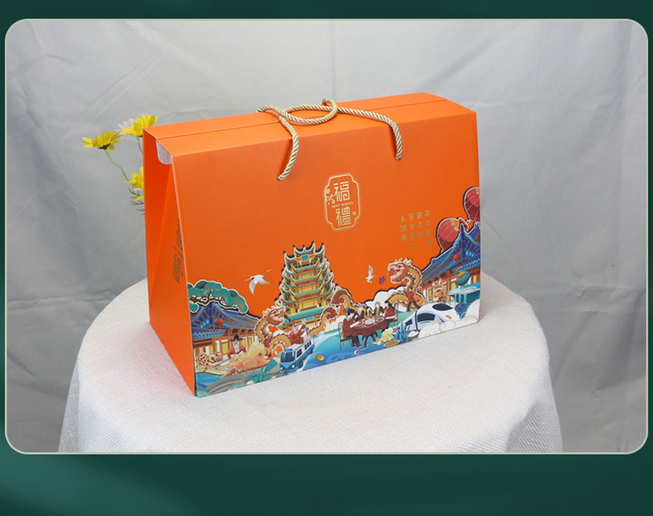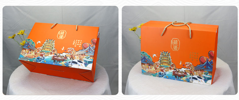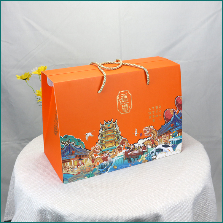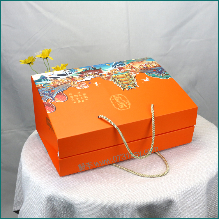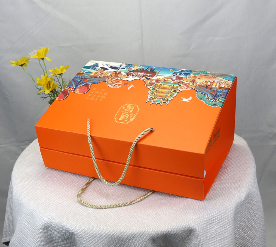 此款为手提绳提手盒,材质选用白卡纸裱三层牛皮E瓦楞,表面做整版烫金工艺,盒子颜色是现在较为流行的“爱马仕橙”,整个插画设计展现包装的别样性,让人眼前一亮的一款包装,材质广泛适用于水果包装礼盒,预制菜包装礼盒,大米包装盒,农产品包装等