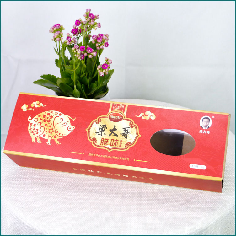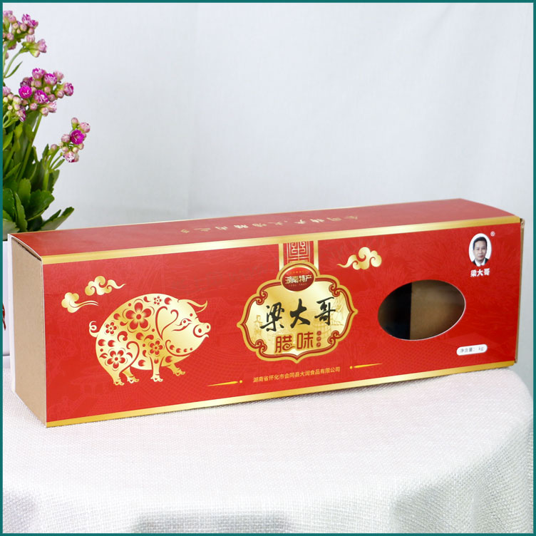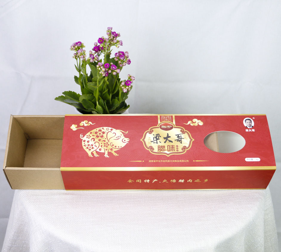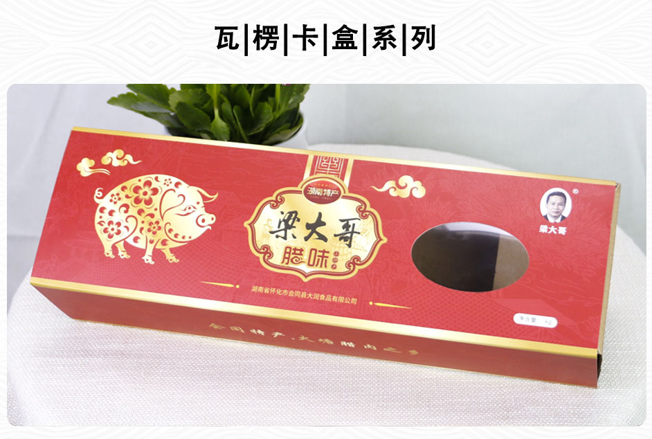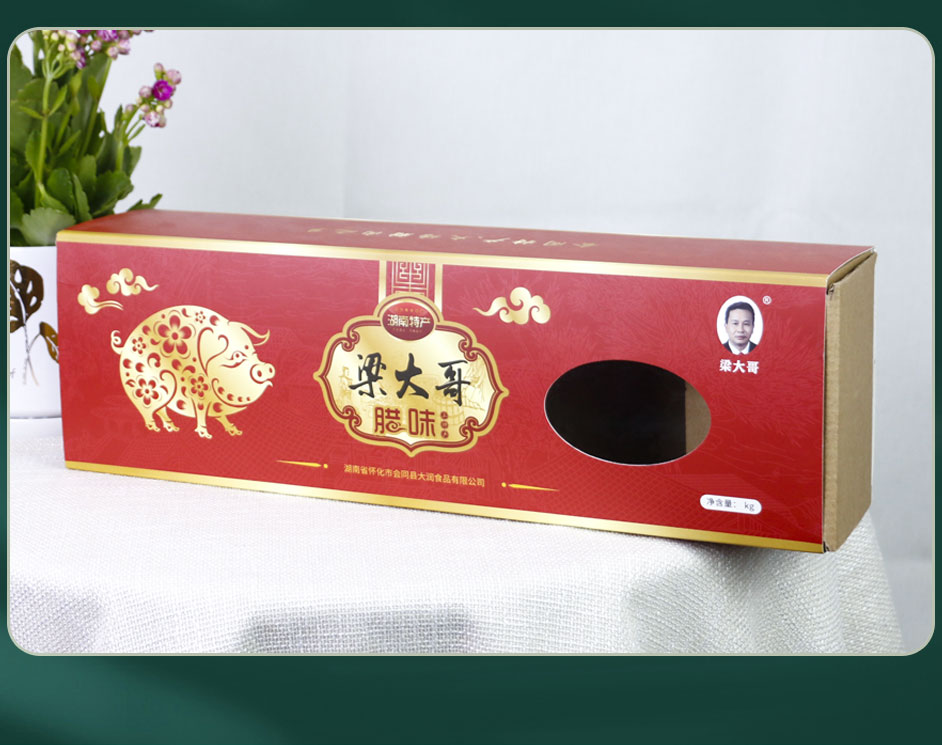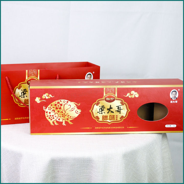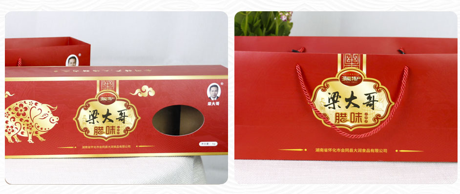 湖南特产“梁大哥”腊味包装礼盒是由长沙包装厂毅丰包装设计制作,该款腊肉包装盒是一款瓦楞卡盒的抽屉盒,礼盒的外盒有一个开窗的工艺,既能对内盒的产品一目了然,也同样美观大方,配同款手提袋携带方便,坚实耐用,此款腊肉包装礼盒一交货就受到了客户的高度好评!