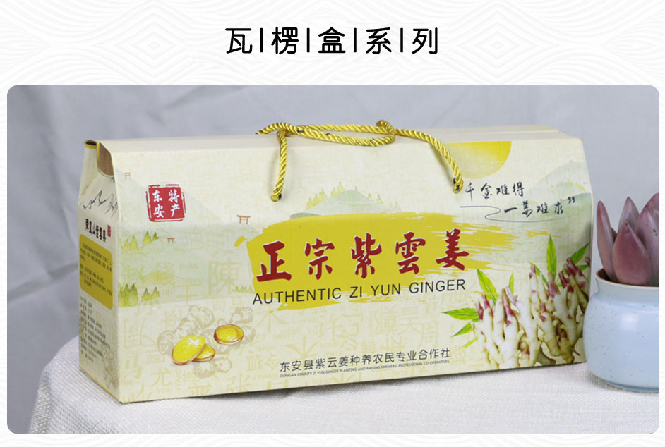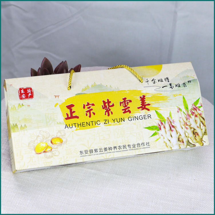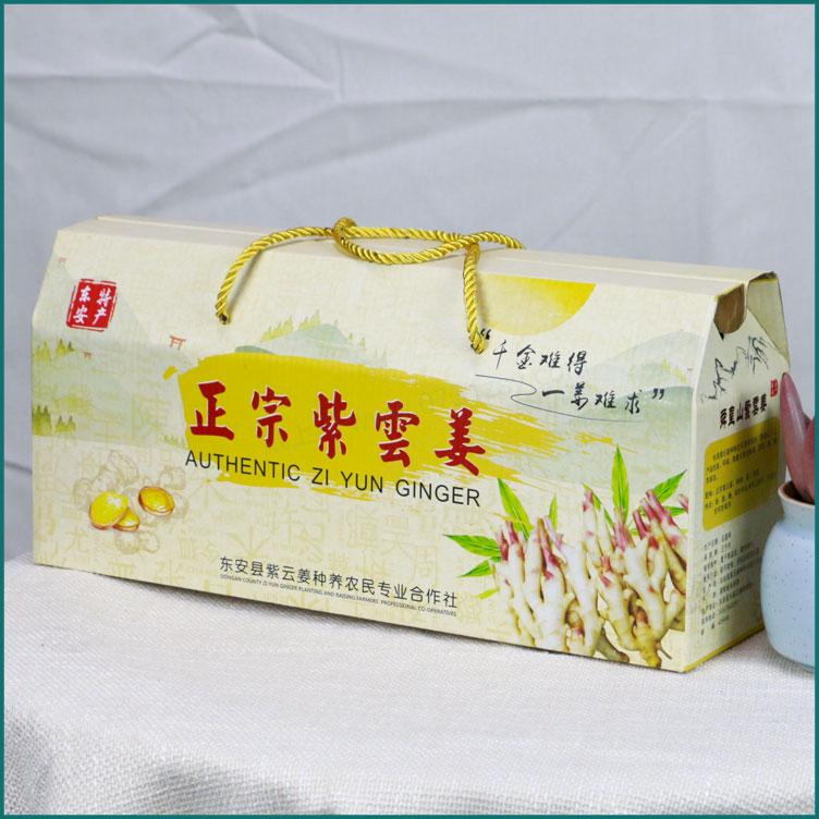 东安县紫云姜包装礼盒适用于农产品包装盒印刷,腊鱼腊肉包装,鸡蛋大米包装盒印刷以及产品包装盒定制等。此款瓦楞纸包装盒是一款手提斜面双插盒,选用白板纸裱三层瓦楞纸制作。东安紫云姜种植在风景秀丽的舜皇山上,产品优良、环保,微量元素含量高,因香、脆、嫩而闻名。好的产品肯定要选择好的包装,长沙包装印刷厂家毅丰,专业的包装盒礼盒厂家!