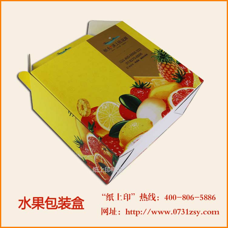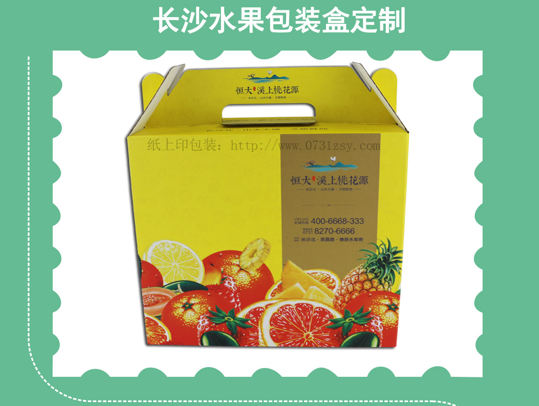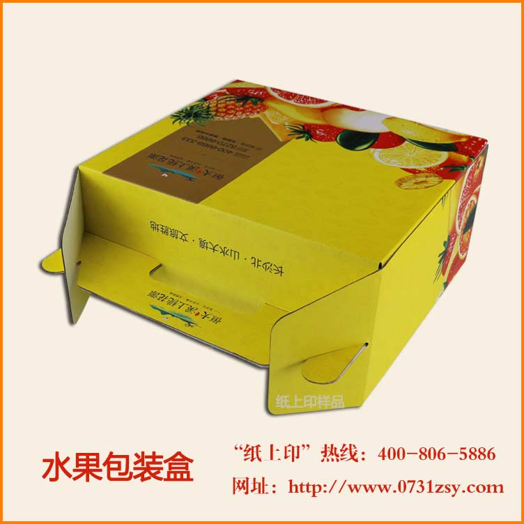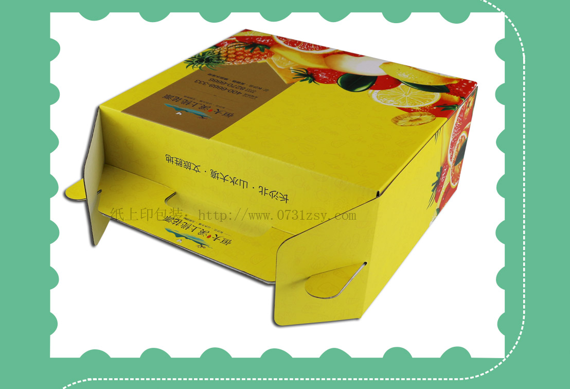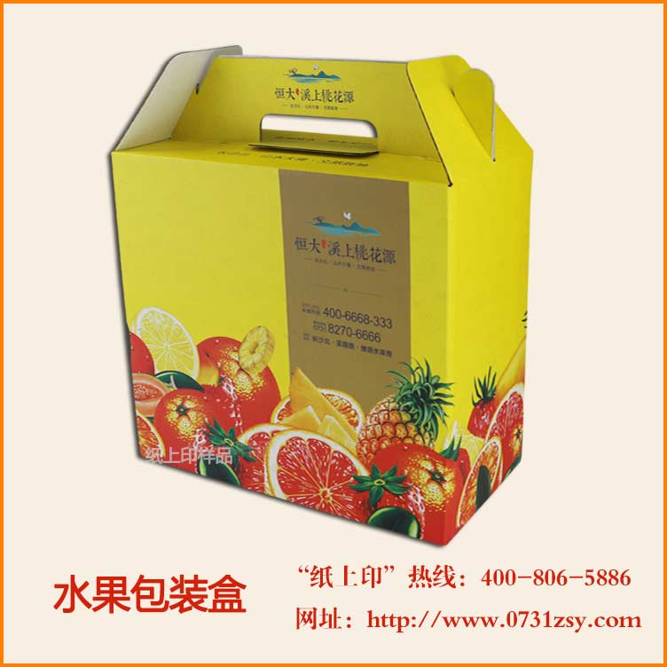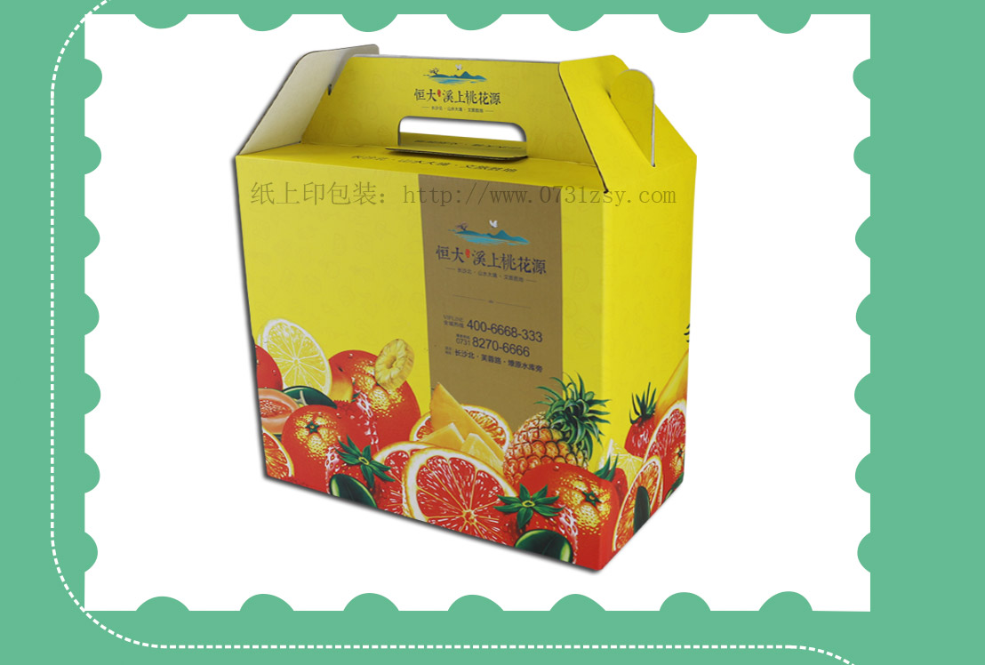 长沙恒大·溪上桃花源为答谢新老业主,在网上搜索寻找能做水果包装盒的厂家,经过前期的设计打样看厂考察最终跟长沙包装盒厂家毅丰达成合作协议,此款水果包装礼盒盒型是自带提手盒,设计上运用明亮的黄色配上缤纷多彩的水果图片,吸引人的视觉更让人垂涎欲滴,采用白瓦裱三层瓦楞纸,表面覆哑膜,方便提携的同时更满足5-8斤的承重量。这款材质的包装盒同样也适用于腊鱼腊肉包装,大米包装,鸡蛋包装等,如您有更多的包装想法请联系长沙毅丰,24服务热线:400-806-5886