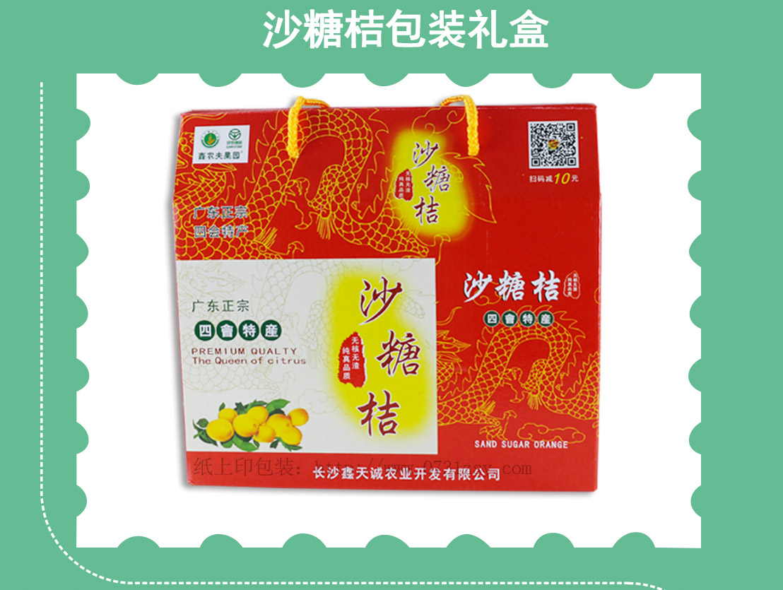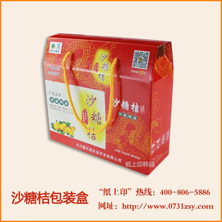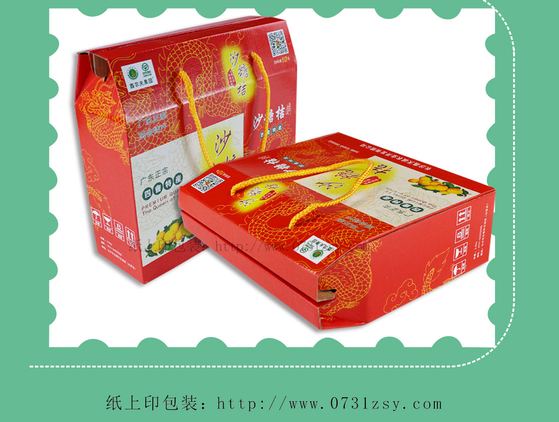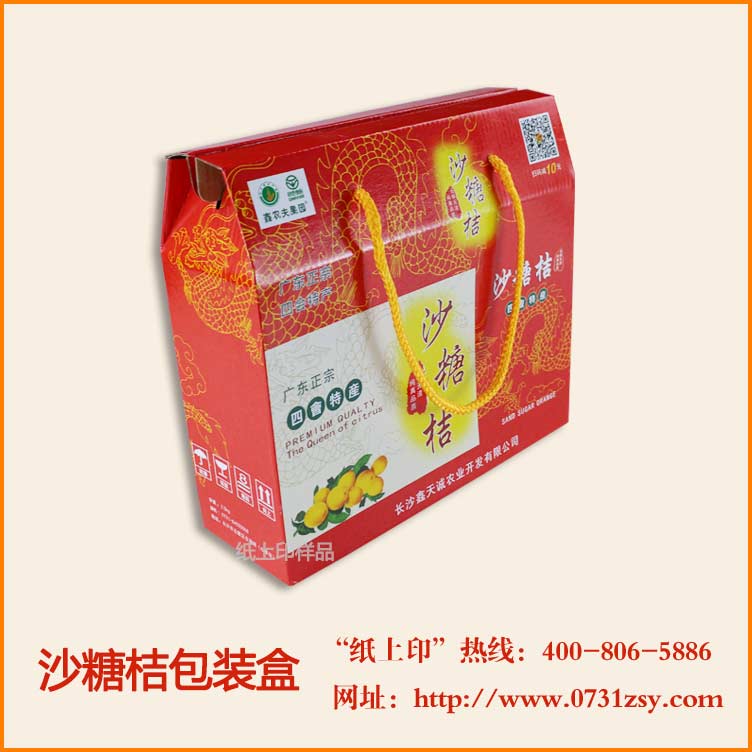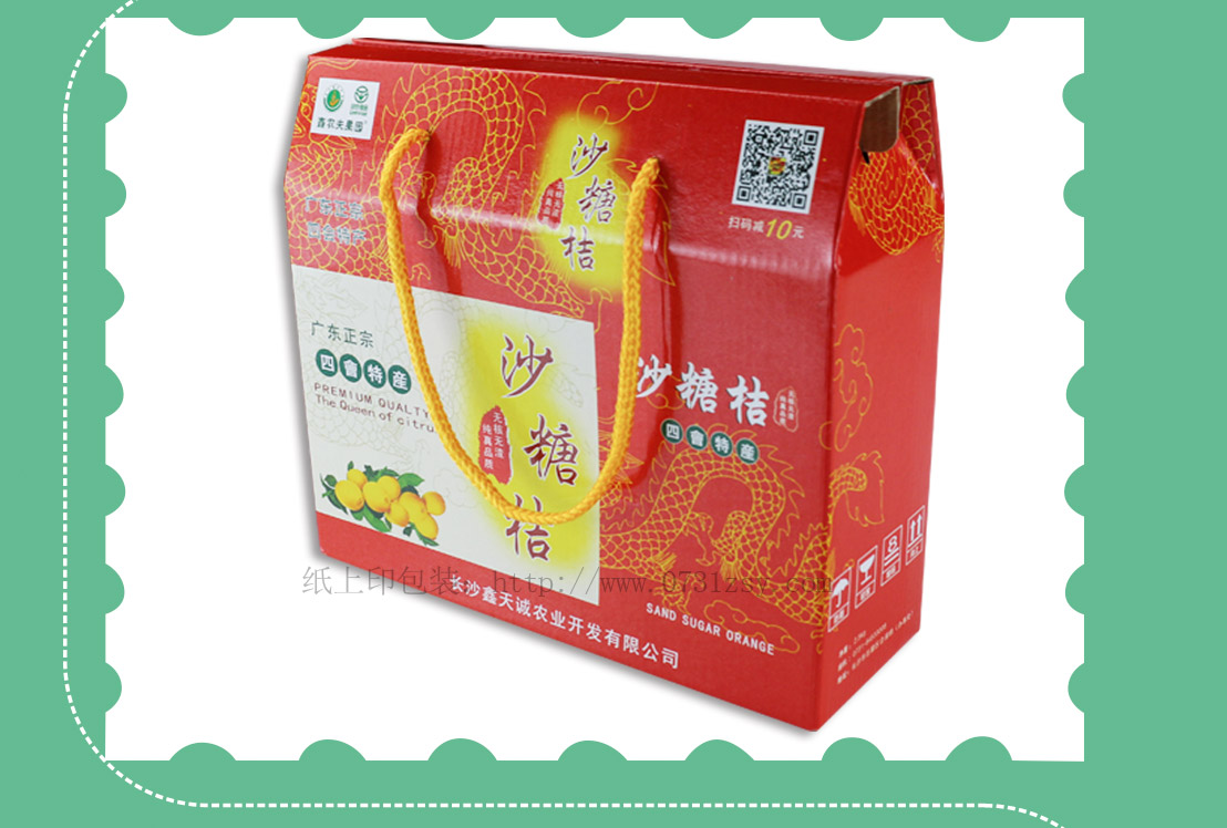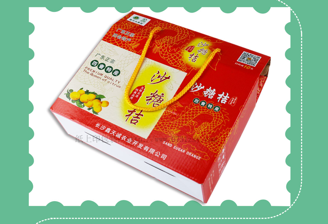 该款沙糖桔包装盒选用三层瓦楞纸裱白板印刷,由专业的包装盒厂家毅丰制作,盒型为斜面双插盒,这种盒型普遍用于水果包装、农产品包装盒定制、食品包装盒印刷以及特产礼品盒包装等.