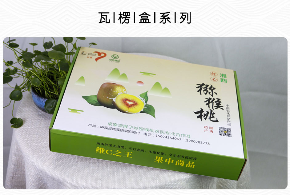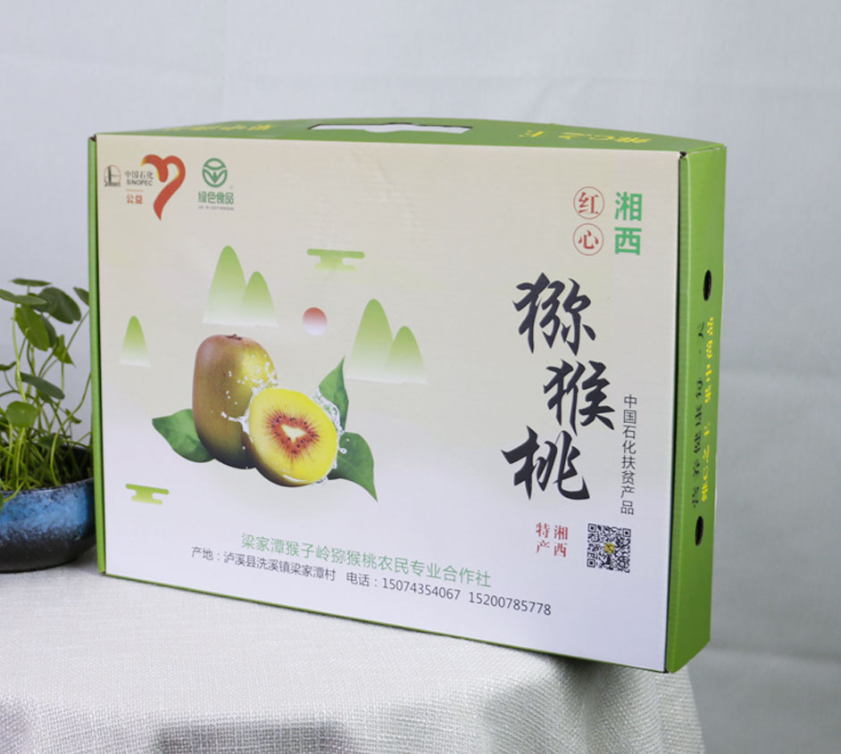 梁家潭猴子岭猕猴桃农民专业合作社定制的猕猴桃包装盒已成功交货,此款红心猕猴桃包装礼盒设计印刷制作出自长沙包装盒厂毅丰,盒型为三层瓦楞飞机盒,提手配塑料提手,方便提携的同时也能承重5-8斤的水果,优质的瓦楞纸同样也适用于腊鱼腊肉包装,农产品包装,特产包装等。