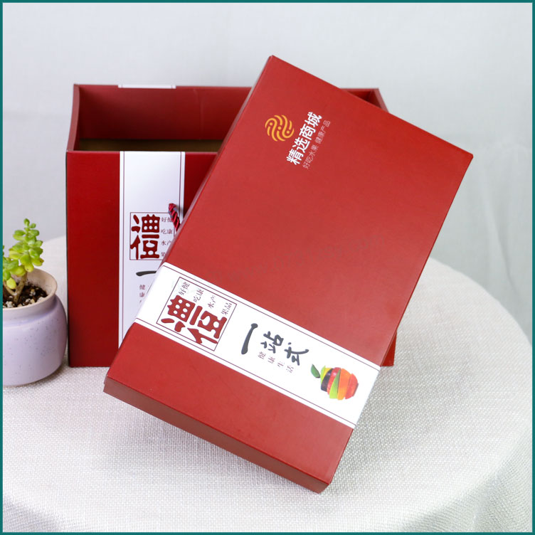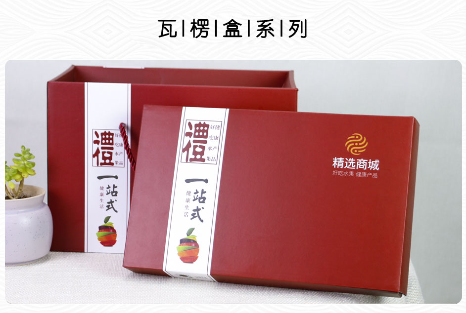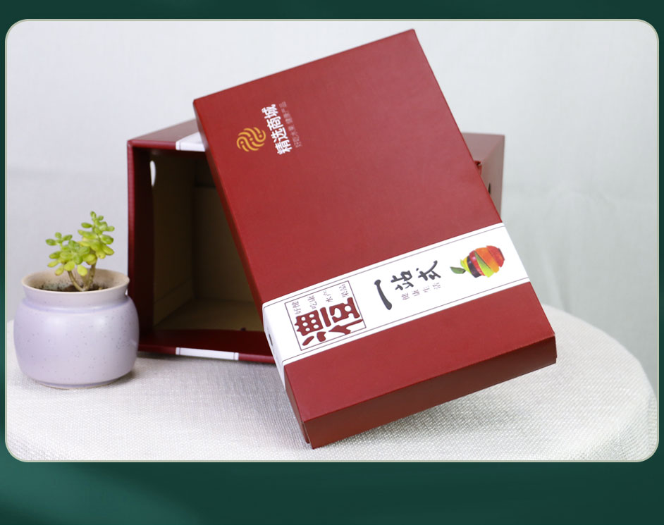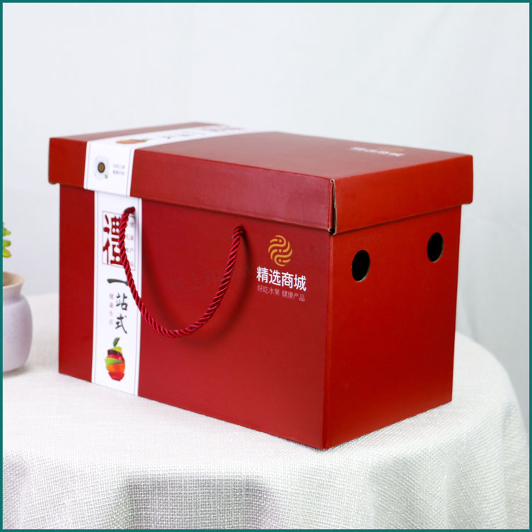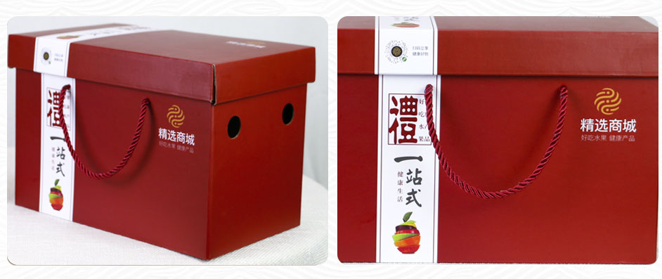 长沙颐而康水果礼盒包装盒型为天地盖盒,精选三层瓦楞制作,可承重5-8斤的水果,侧面的开孔设计起到了一个透气排气的作用,配上同色三股棉绳方便提携,精品水果包装盒款式新颖,承重力强,很受消费者认可.此款水果包装盒是由长沙包装盒厂毅丰设计制作而成,设计颜色整体运用大气的中国红,侧面竖封条的设计突出产品特性,整体简洁明亮.