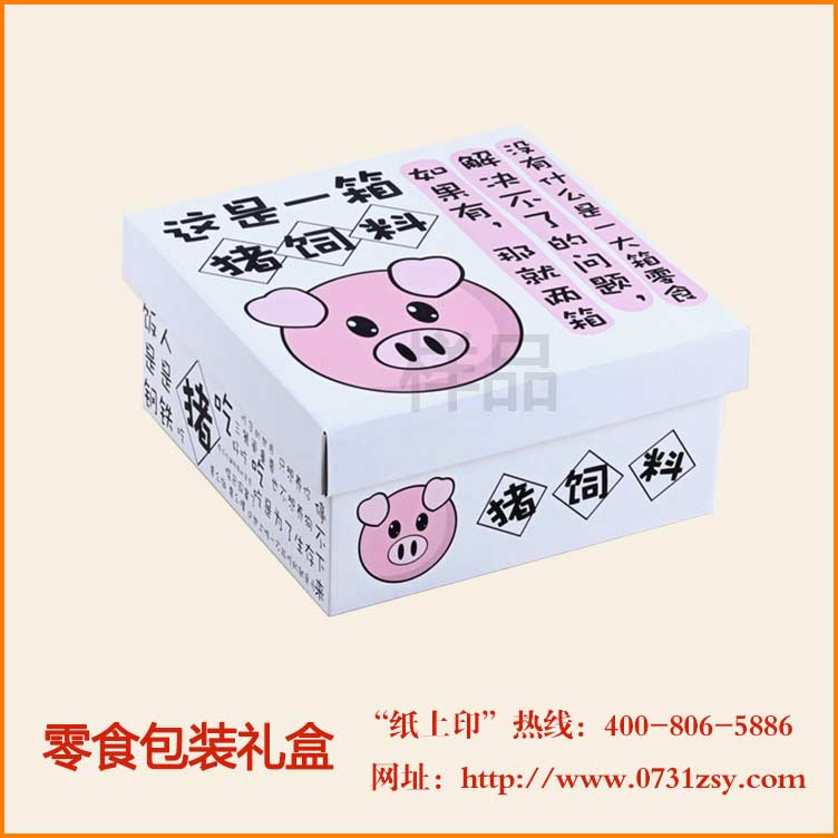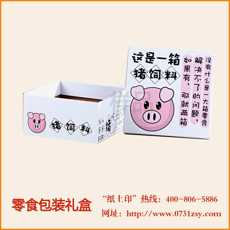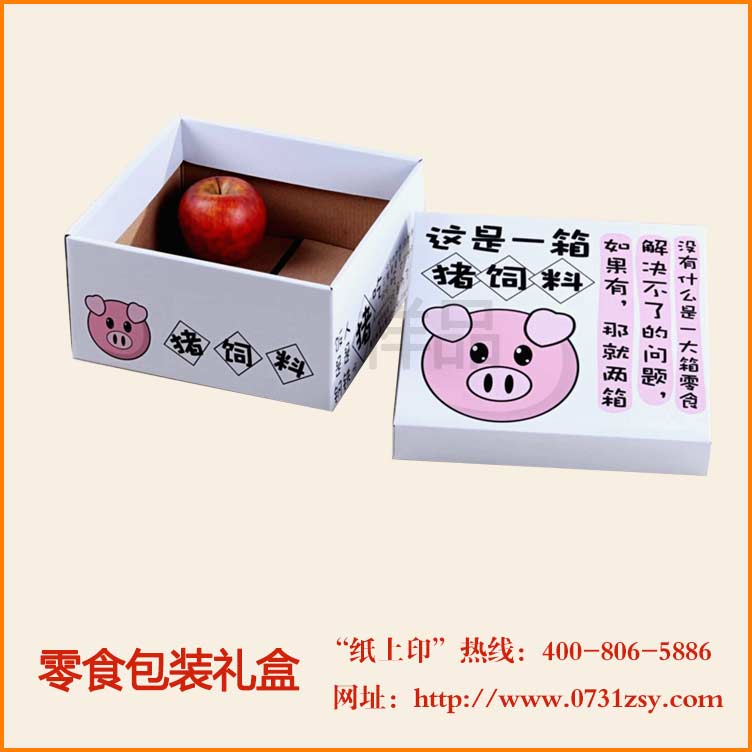 长沙零食包装毅丰包装印刷厂为猪饲料设计制作了一款零食包装盒,此款零食包装盒为了突出款式采用了天地盖盒,而为了达到节约成本的目的,采用了瓦楞纸包装制作而成,零售包装盒封面设计并采用卡通猪和艺术字体来表达产品主题,更能突出外包装盒的特色,能吸人眼球,达到推广产品,并有助于提升产品销售的目的。