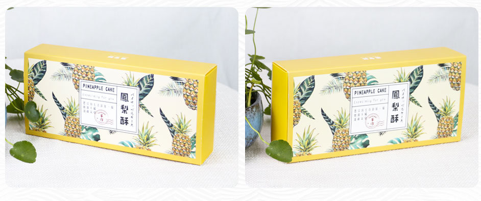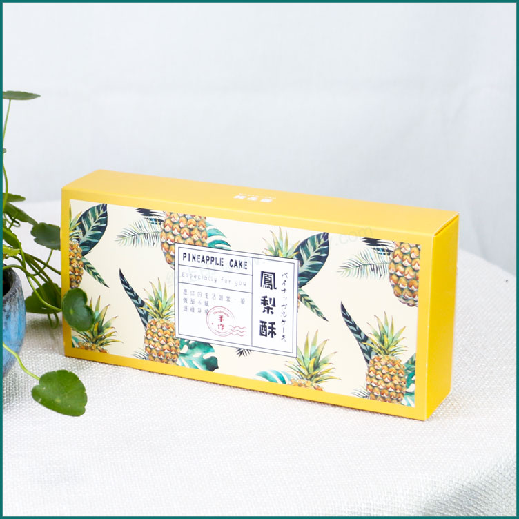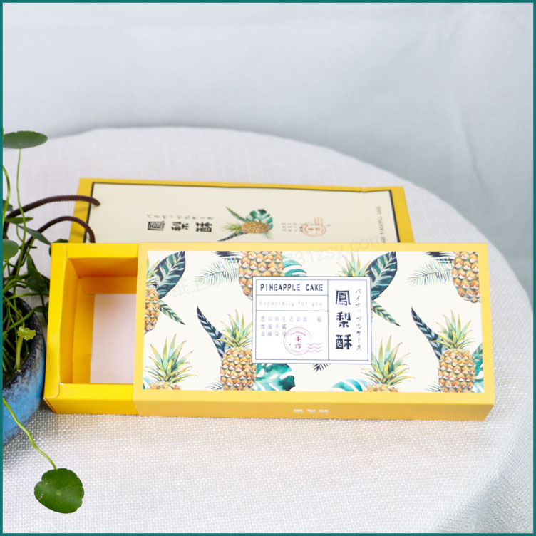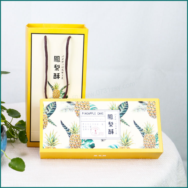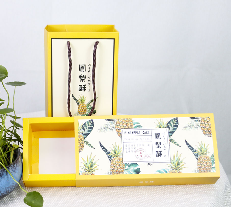 此款食品包装盒印刷选用300克白卡纸制作,盒型为抽屉盒配同款手提袋,常用于食品包装,零食包装定制等,长沙包装厂毅丰在设计上用到明亮的黄色,插画的设计风格配上产品的LOGO文字简洁明了,这款凤梨酥的包装卡盒已交货完成,也受到消费者喜爱.