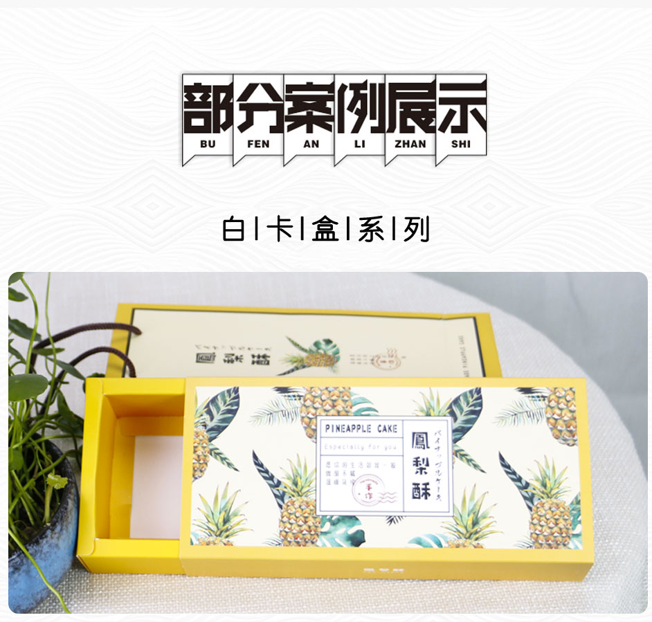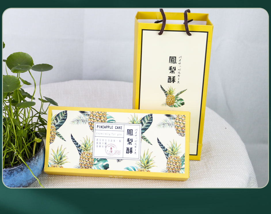 【使用范围】:该款凤梨酥包装卡盒材质广泛适用于零食包装盒订制,食品包装盒印刷,特产包装盒制作等礼品盒包装印刷。