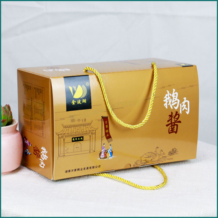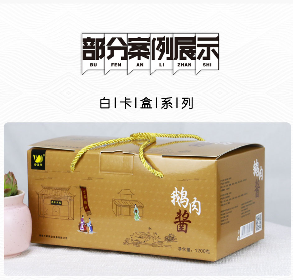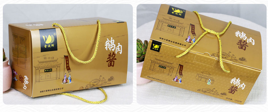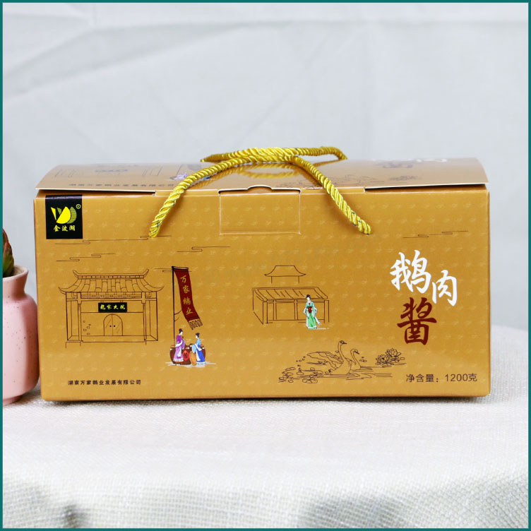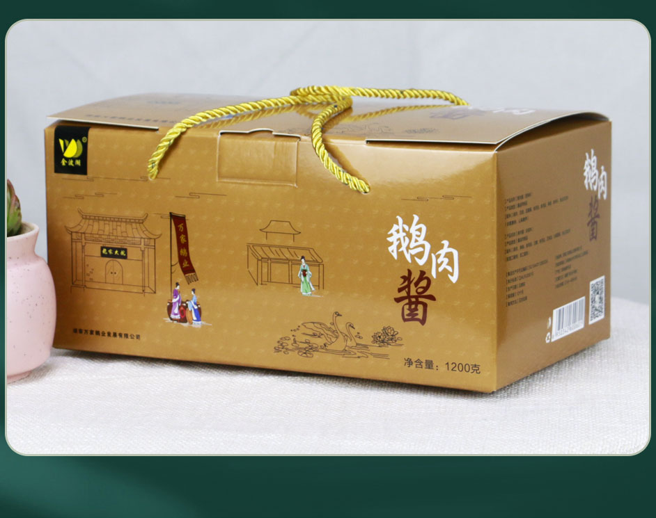 万彩网【使用范围】:湖南万家鹅业鹅肉酱包装盒材质为白卡纸对裱,此款白卡纸包装盒广泛使用于:食品包装盒,蜂蜜包装盒,茶油包装礼盒等领域