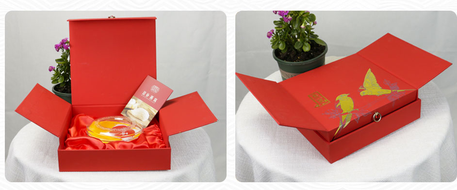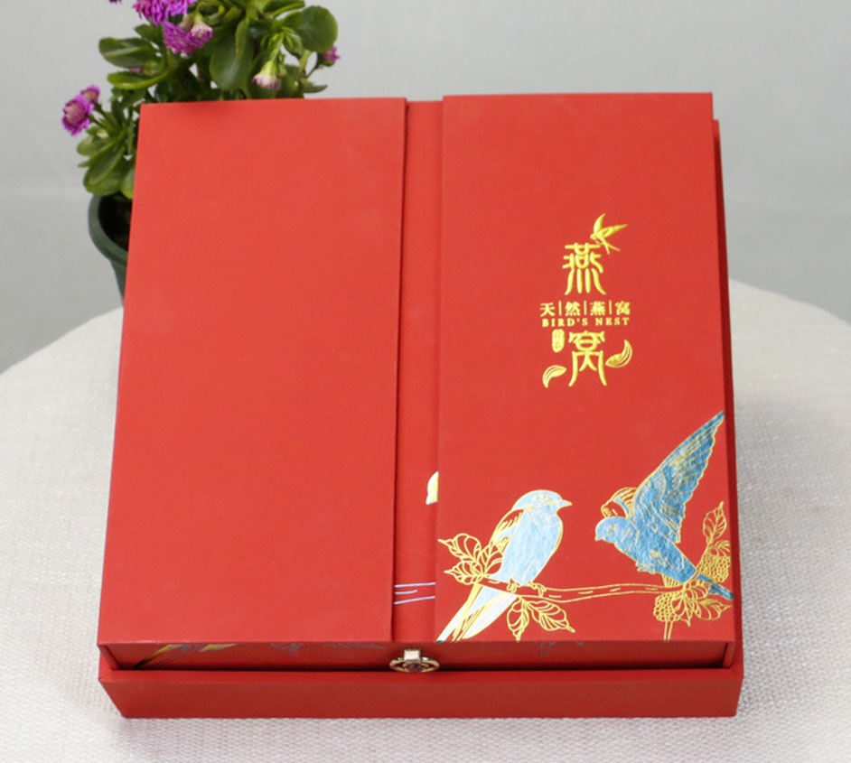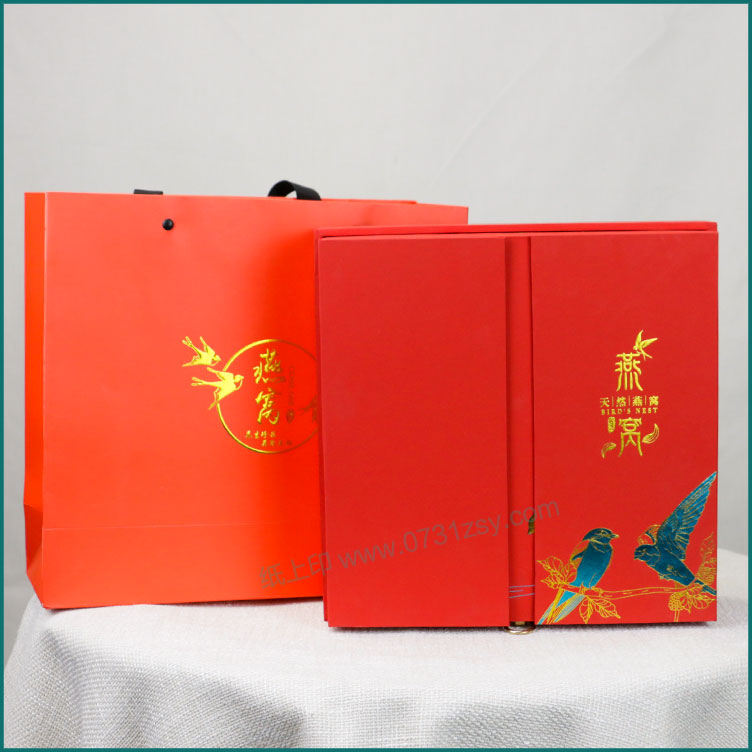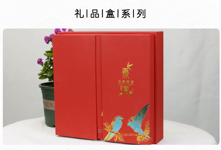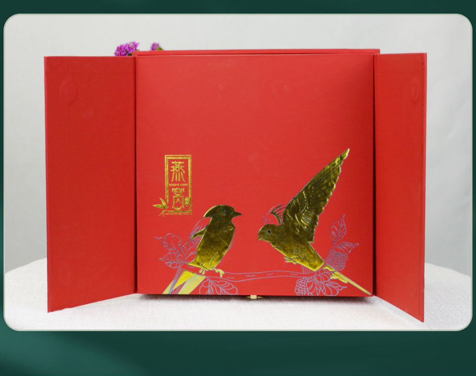 【使用范围】:此款燕窝礼盒包装是一款双开式的精装盒,选用特种纸裱灰板,烫金工艺,广泛适用于茶叶包装、蜂蜜包装、酒类礼盒包装、保健品包装等礼盒包装定制。