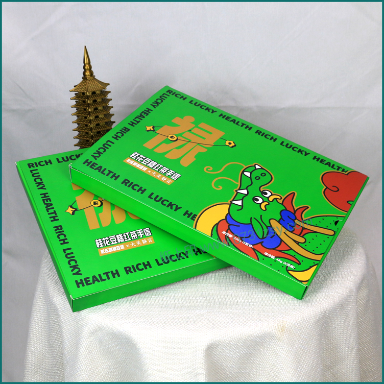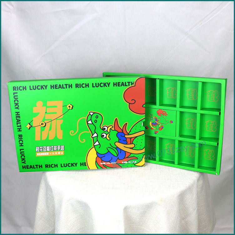 此款食品包装盒印刷由长沙包装印刷厂毅丰制作而成,这款包装盒是一款较个性张扬的食品包装,盒子主色绿色足够吸引眼球,盒型为抽屉盒,里面也是同款材质的内衬可放置16个产品,起到很好的摆放效果。整体包装盒材质精选白卡纸印刷制作,广泛适用于农产品包装盒订制,食品包装盒印刷,特产包装礼盒制作等礼品盒包装印刷。