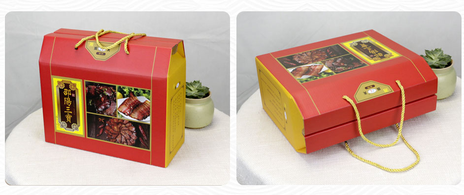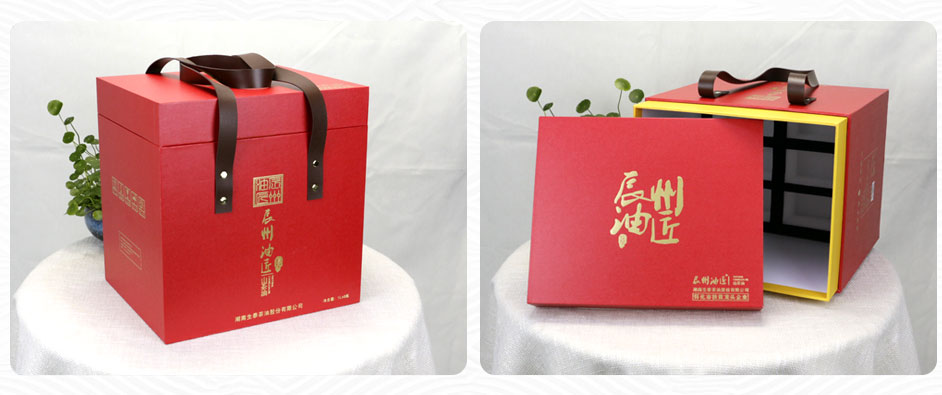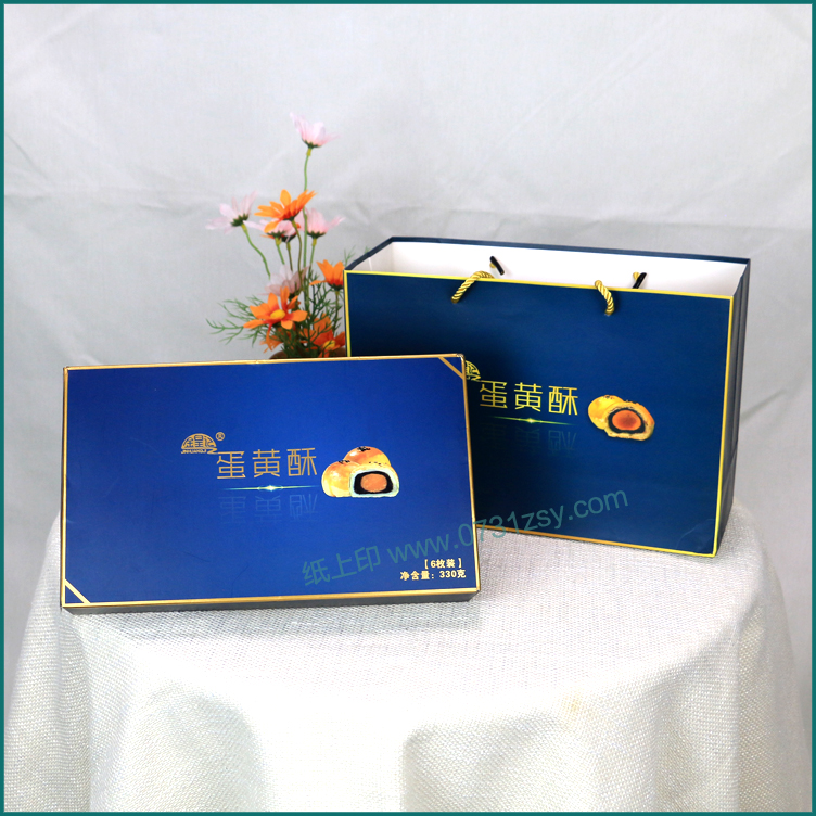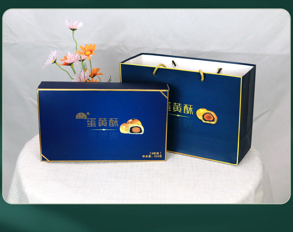此款蛋黄酥包装材质为350克白卡纸,外盒做UV、烫金工艺,侧面开口处做压型拉链条,是一款非常适合做食品包装的白卡纸包装盒,长沙包装厂毅丰结合蛋黄酥的包装再制作同款手提袋,使产品提携方便,同样也达到促进产品销量的效果。