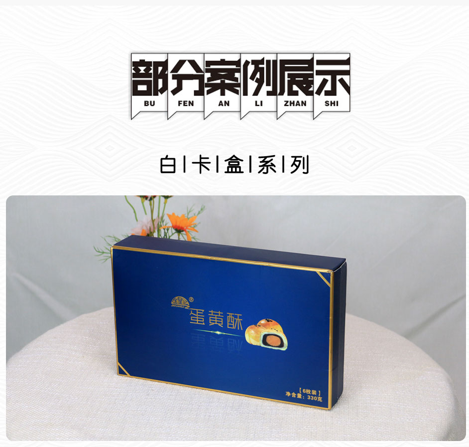 【使用范围】:蛋黄酥包装材质为白卡纸,广泛适用于粽子包装盒订制,月饼包装盒定制,特产包装盒制作等食品包装印刷。