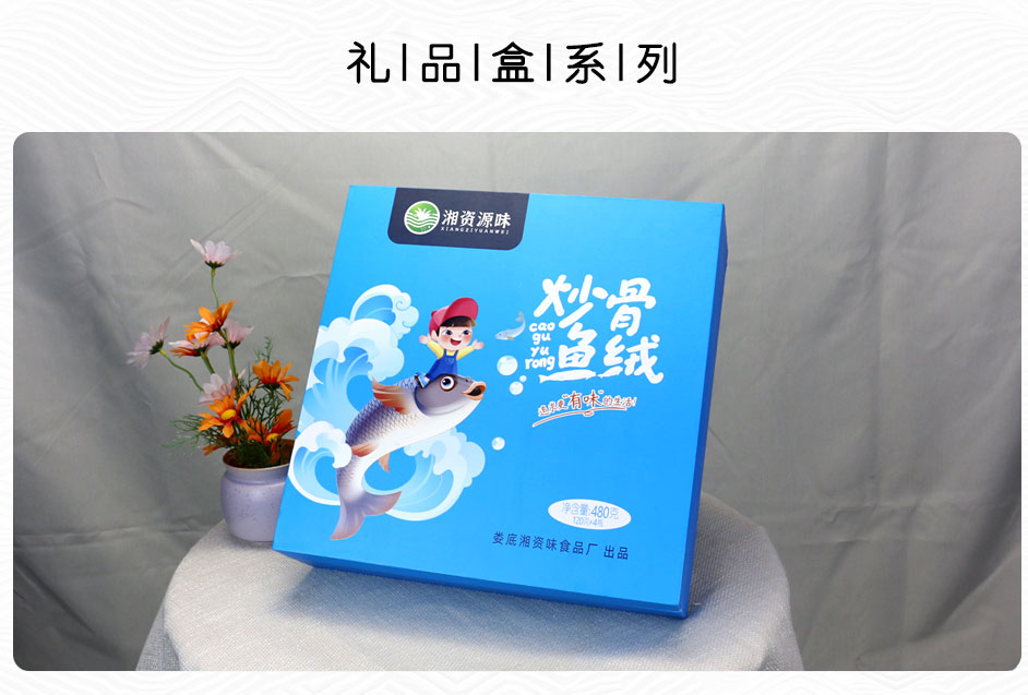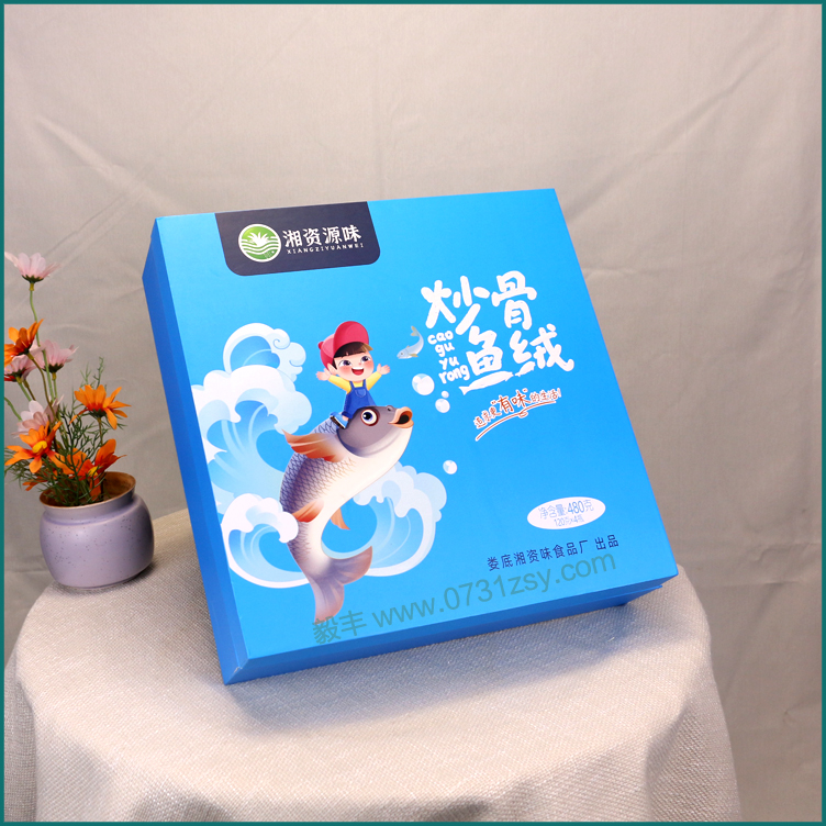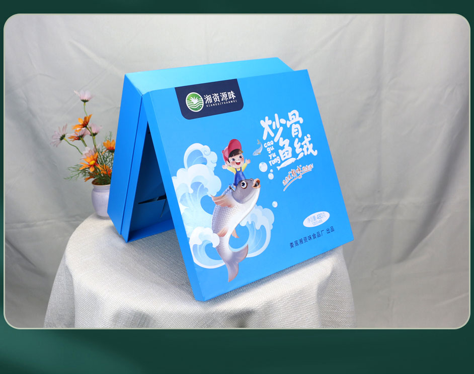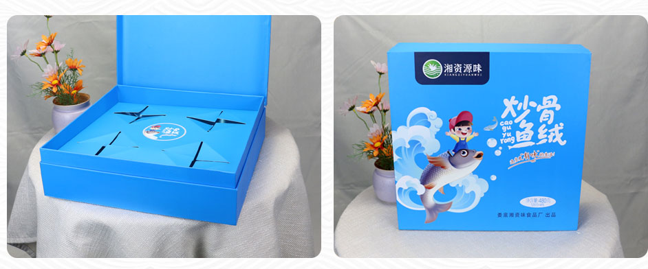 【使用范围】:炒骨鱼绒包装盒材质为铜板纸裱灰板制作,盒面做UV工艺,此款盒型也适用于农产品包装、茶油礼盒包装、蜂蜜包装等礼品包装盒定制