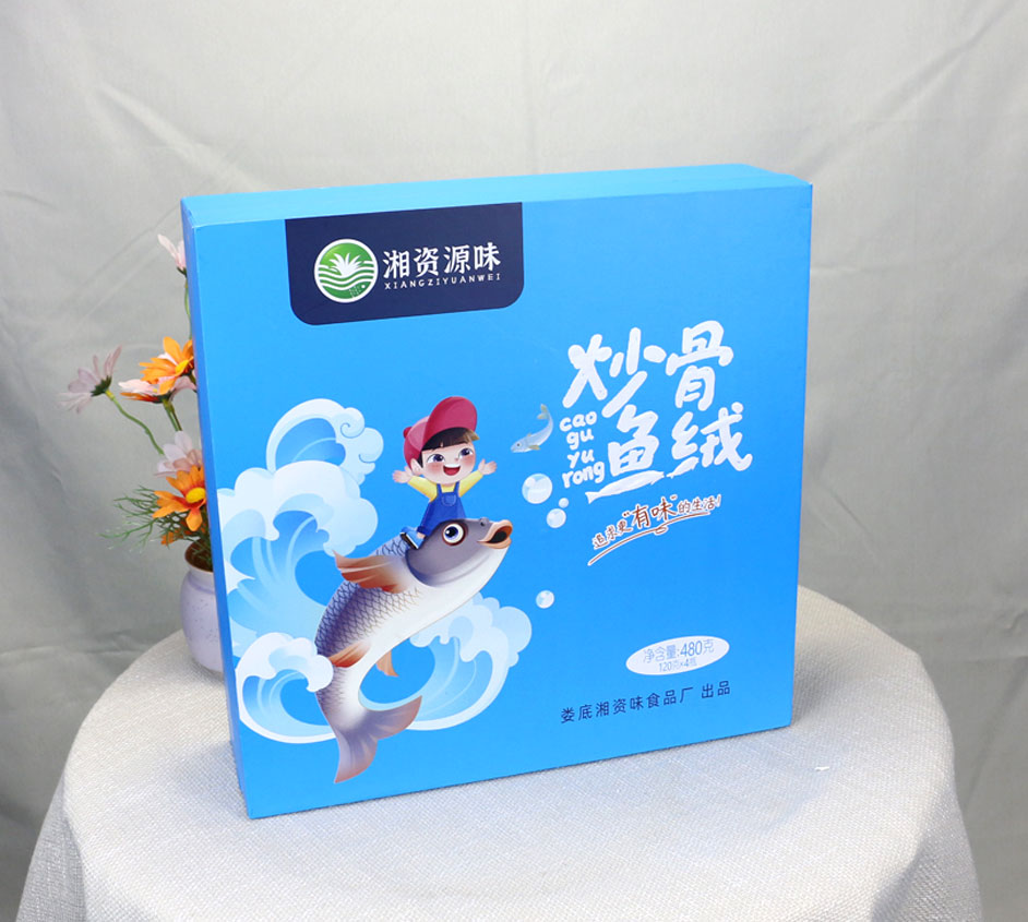 炒骨鱼绒包装盒材质为铜板纸裱灰板制作,包装整体主色为蓝色,插画及产品名称做了UV工艺,起到点睛的作用,此款盒型也适用于农产品包装、茶油礼盒包装、蜂蜜包装等礼品包装盒定制,长沙包装盒厂毅丰包装提供设计/打样/制作一体化,热线:4008065886