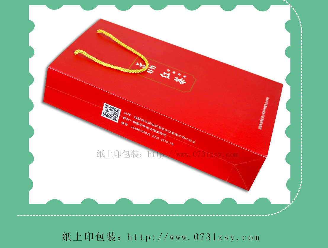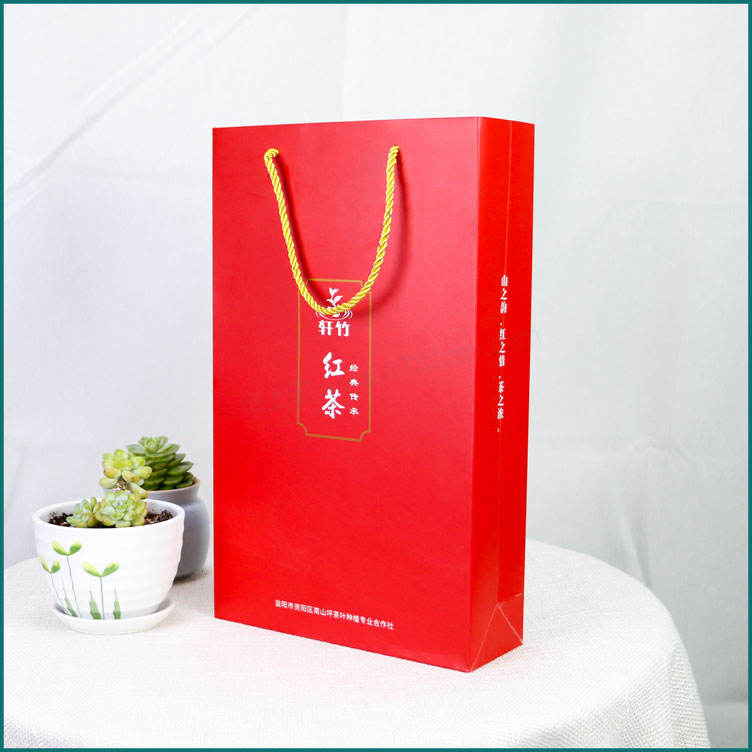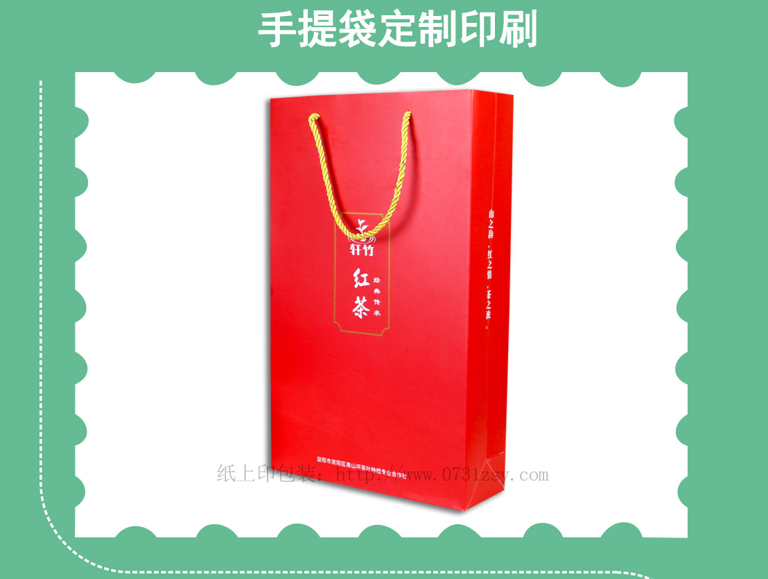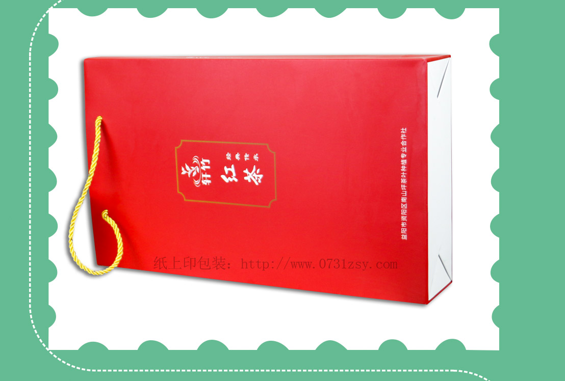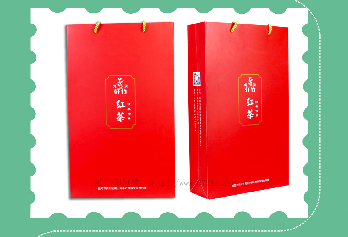轩竹红茶手提纸袋采用250克白卡纸印刷制作,出自长沙手提袋设计制作厂家长沙纸上印包装,在设计上结合产品特征整体用到正红色,手提袋正中间印制产品名称,简洁大方,此款手提袋材质广泛适用于公司手提袋,企业礼品袋,纸质手提袋,纸袋印刷等,长沙手提袋制作厂家当天出货当天送,热线:400-806-5886
