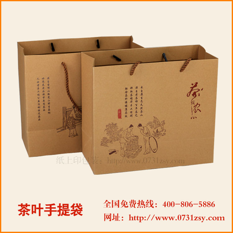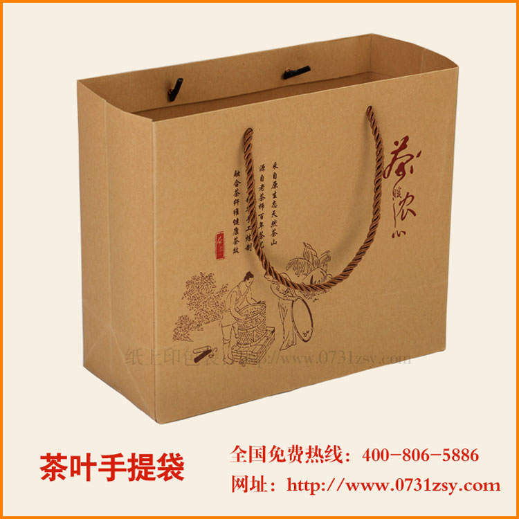 【包装工艺】:250克牛皮纸四色印刷、压型、做袋、穿咖啡色三股绳