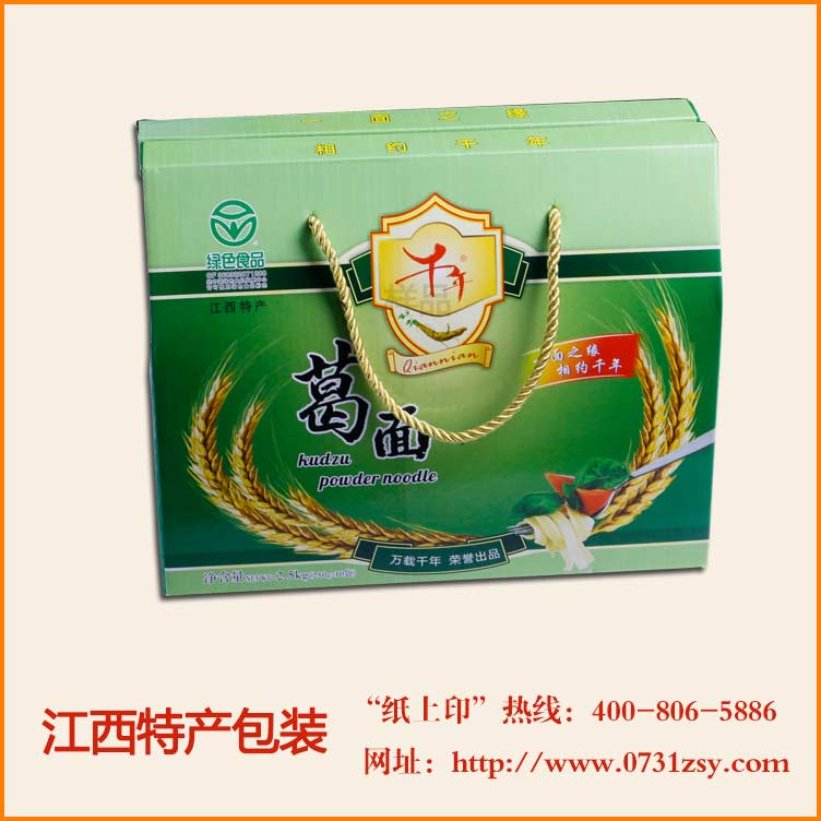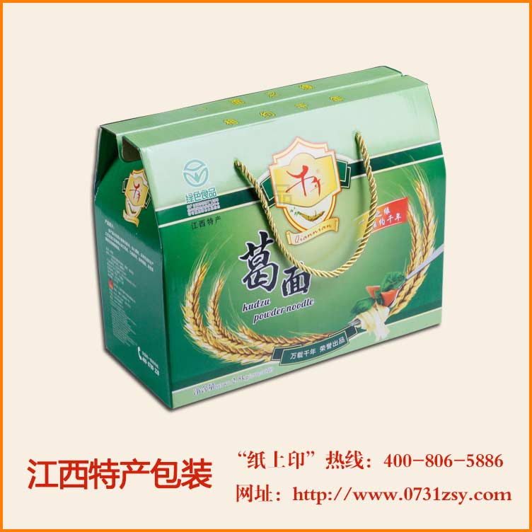 长沙产品外包装公司毅丰包装厂设计制作的葛面包装盒已出大货,客户收到货后,对葛面包装盒的数量和品质感到很满意,因而愿与长沙毅丰包装盒厂达成长期的合作协议,绿色食品江西特产葛面包装盒是采用白板纸裱瓦楞纸制作而成,并采用手提盒,便于客户提携又能达到节约成本的目的。