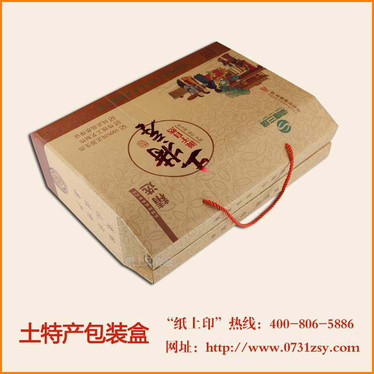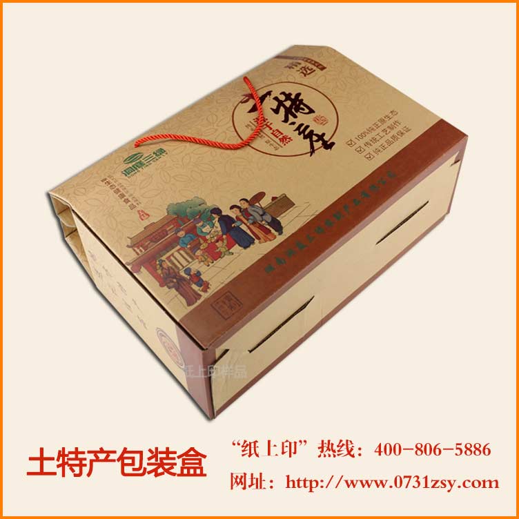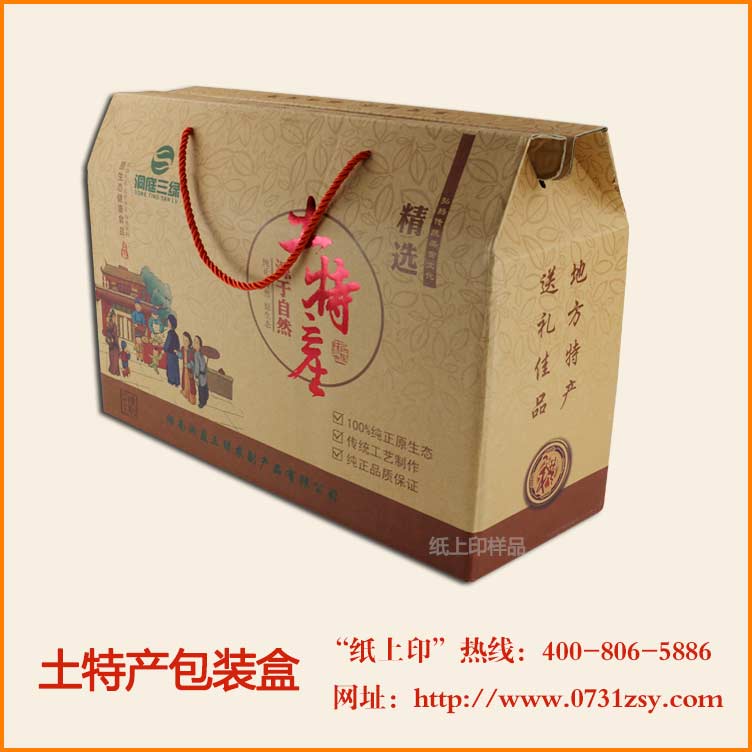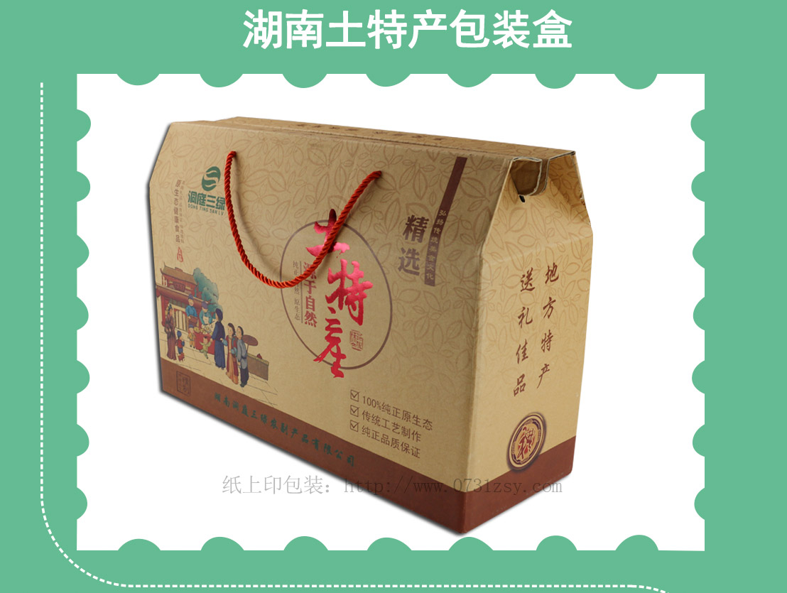 湖南土特产包装盒材质精选三层牛皮纸裱瓦楞制作而成,烫红金的工艺突出“土特产”尤为吸引眼球,本色的牛皮纸更能突出土特产的原汁原味。450X148X300的超大容量承载着对顾客满满的爱意,这款土特产包装盒的设计更适用于对材质和容量高要求的产品。
