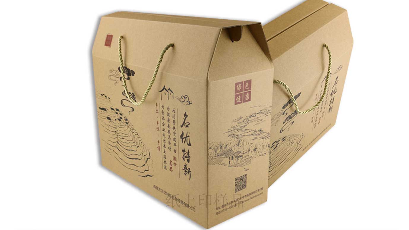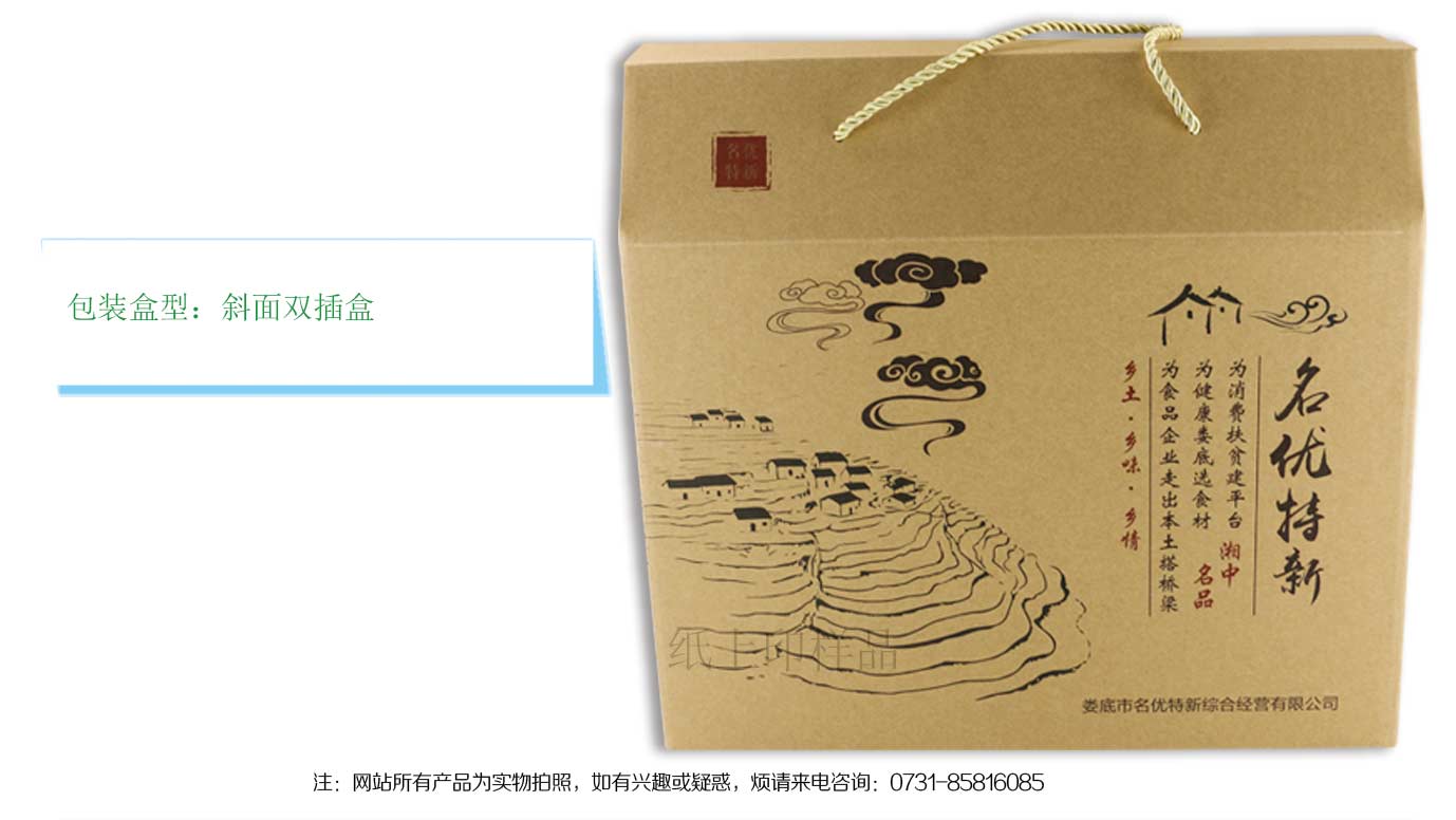 娄底市名优特新特产礼盒采用牛皮纸裱三层瓦楞制作,是长沙包装厂毅丰倾情制作而成,该款牛皮纸礼盒挺度好抗压强,广泛适用于农产品包装盒,大米包装盒,鸡蛋/活鸡包装盒,腊鱼/腊肉包装盒等,牛皮纸礼品盒外包装设计厂家,免费设计,1~2天定稿,热线:4008065886
