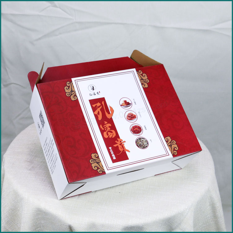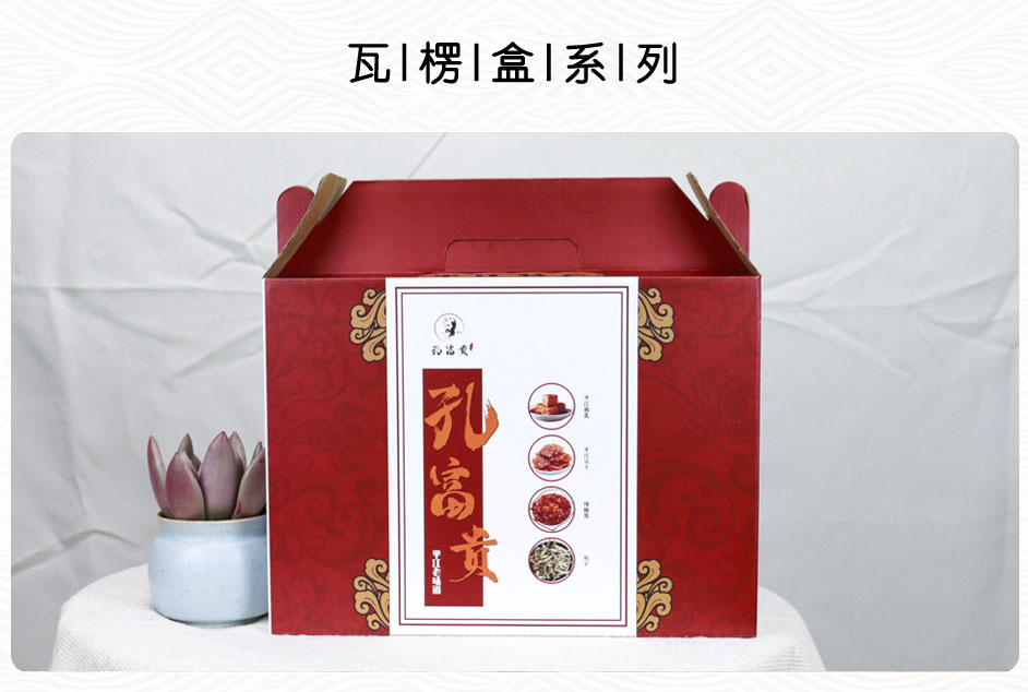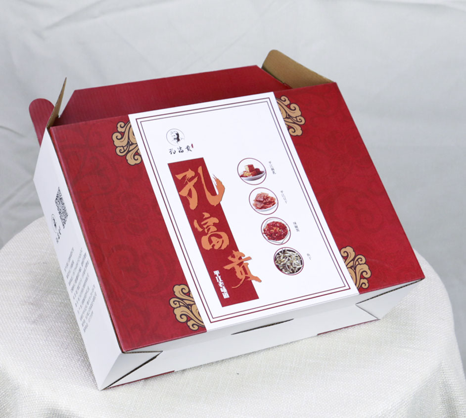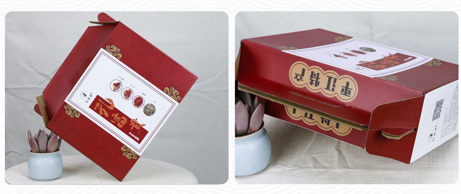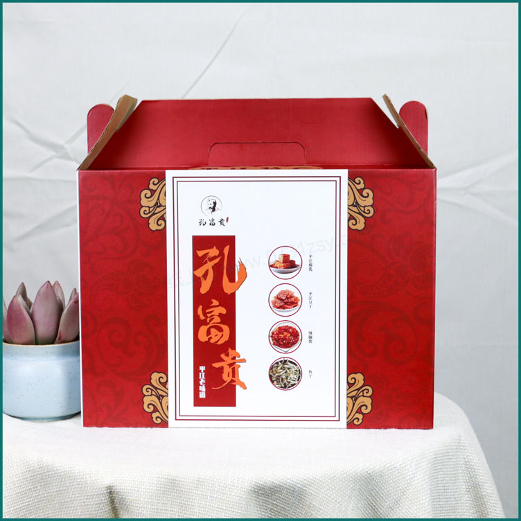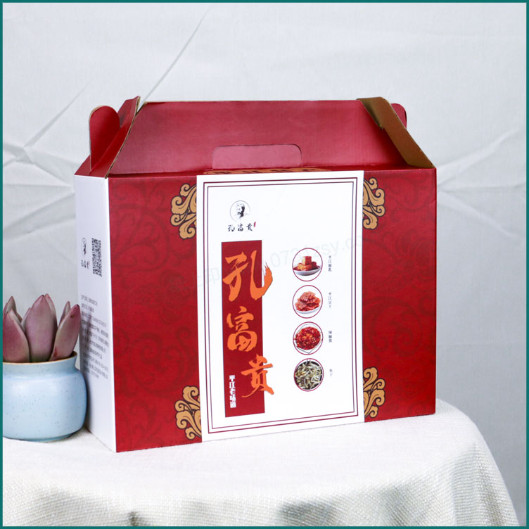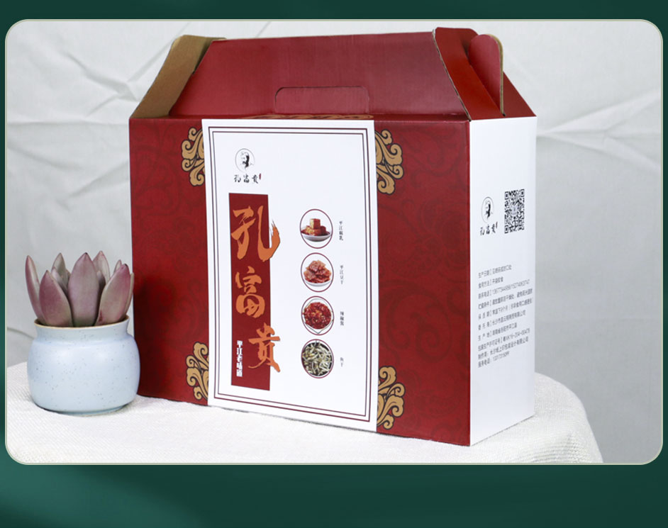 湖南平江特产礼品盒“孔富贵”制作出自长沙包装厂毅丰包装,此款特产礼品盒盒型为自带提手盒,选用白板纸裱三层瓦楞制作,可承重5~8斤左右,其材质也广泛适用于特产包装,茶油包装盒,腊鱼腊肉礼盒包装,鸡蛋包装,大米包装礼盒定制,酒类包装盒等。这款特产礼品盒是比较常见的一款盒型,方便提携也凸显出整体包装盒的美观大方。