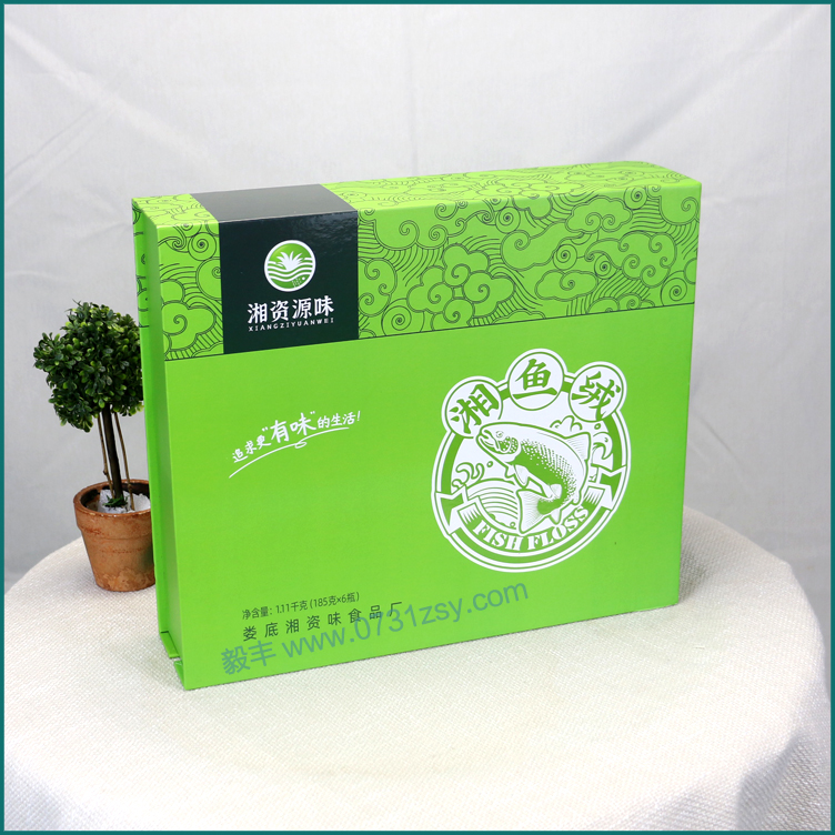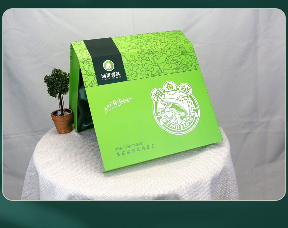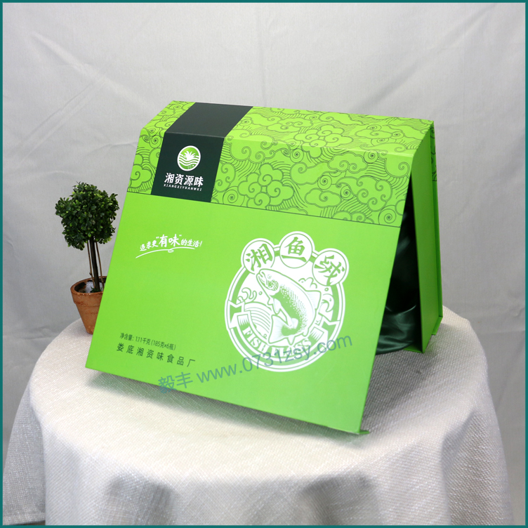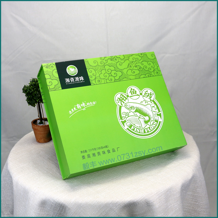 娄底湘资味食品厂办公室地址位于湖南几何中心娄底市,于2020年08月13日在涟源市市场监督管理局注册成立,主要经营罐头、腊制品、鲜鱼制品、豆制品、蔬菜制品、麻辣制品、农副产品品、自热火锅、自热米饭、自热粉、食用油加工、研发、销售。此款特产礼品盒材质为铜版纸裱灰板制作,外盒表面运用UV工艺突出产品的特色,内衬选用珍珠棉裱绿色绸布,即固定产品又具有美观性,是一款适用于各种特产包装盒,茶油包装盒,农产品礼盒包装,茶叶礼盒定制,酒类包装盒等,长沙市包装公司找毅丰包装,设计打样制作一体化,专业专注