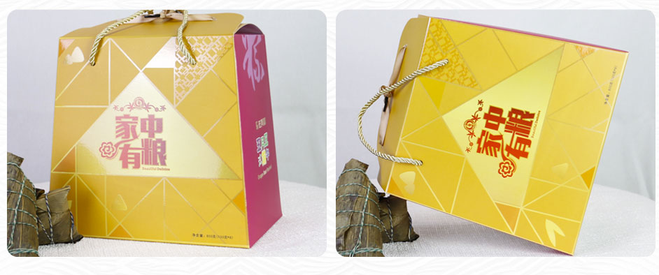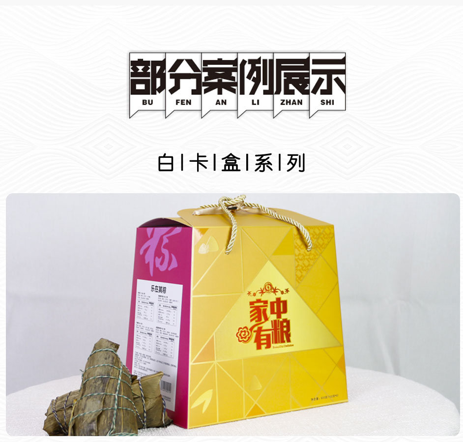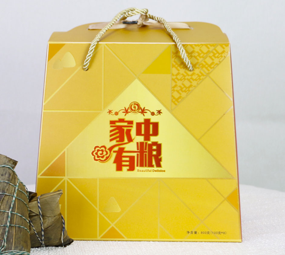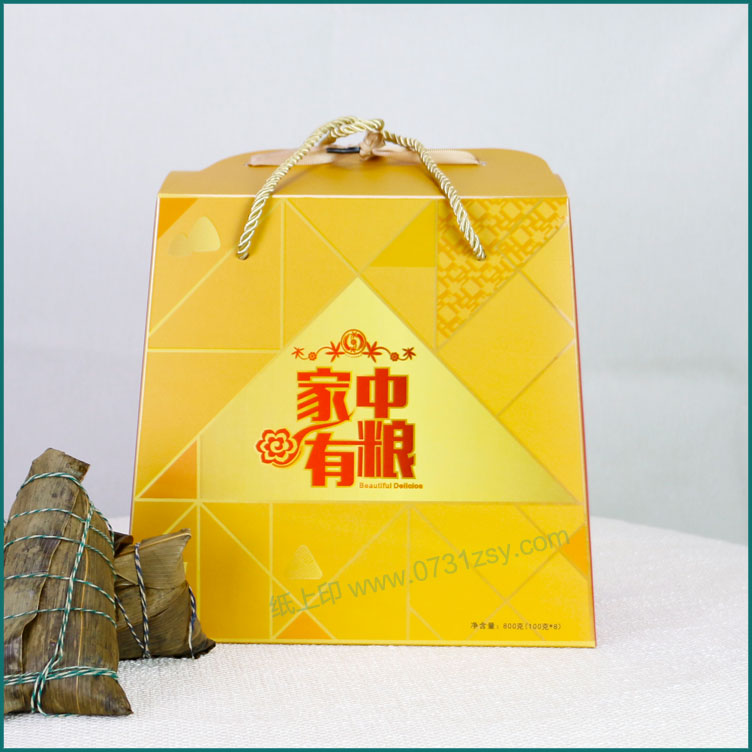 “家中有粮”粽子包装盒定制是一款白纸材质的包装盒,上窄下宽的梯形盒型,外盒UV工艺,出自长沙包装印刷厂毅丰包装,白卡纸的材质广泛适用于食品包装盒、特产包装礼盒、腊鱼腊肉包装盒等,长沙粽子包装盒免费设计,1~2天定稿,热线:4008065886